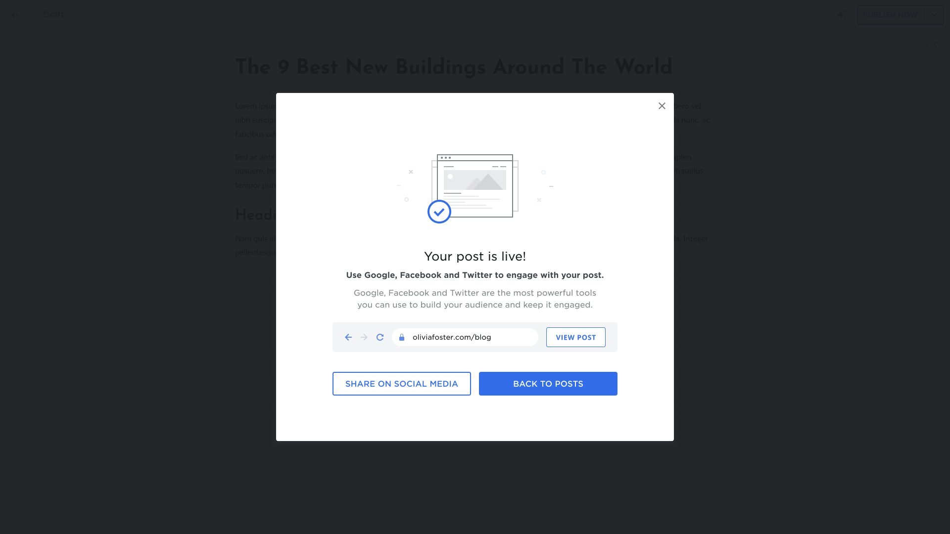 - After your blog post is published, you will see the confirmation pop-up. You can view your blog post on the live site by clicking View Post on the pop-up and sharing your blog content on social media by clicking Share on Social Media: