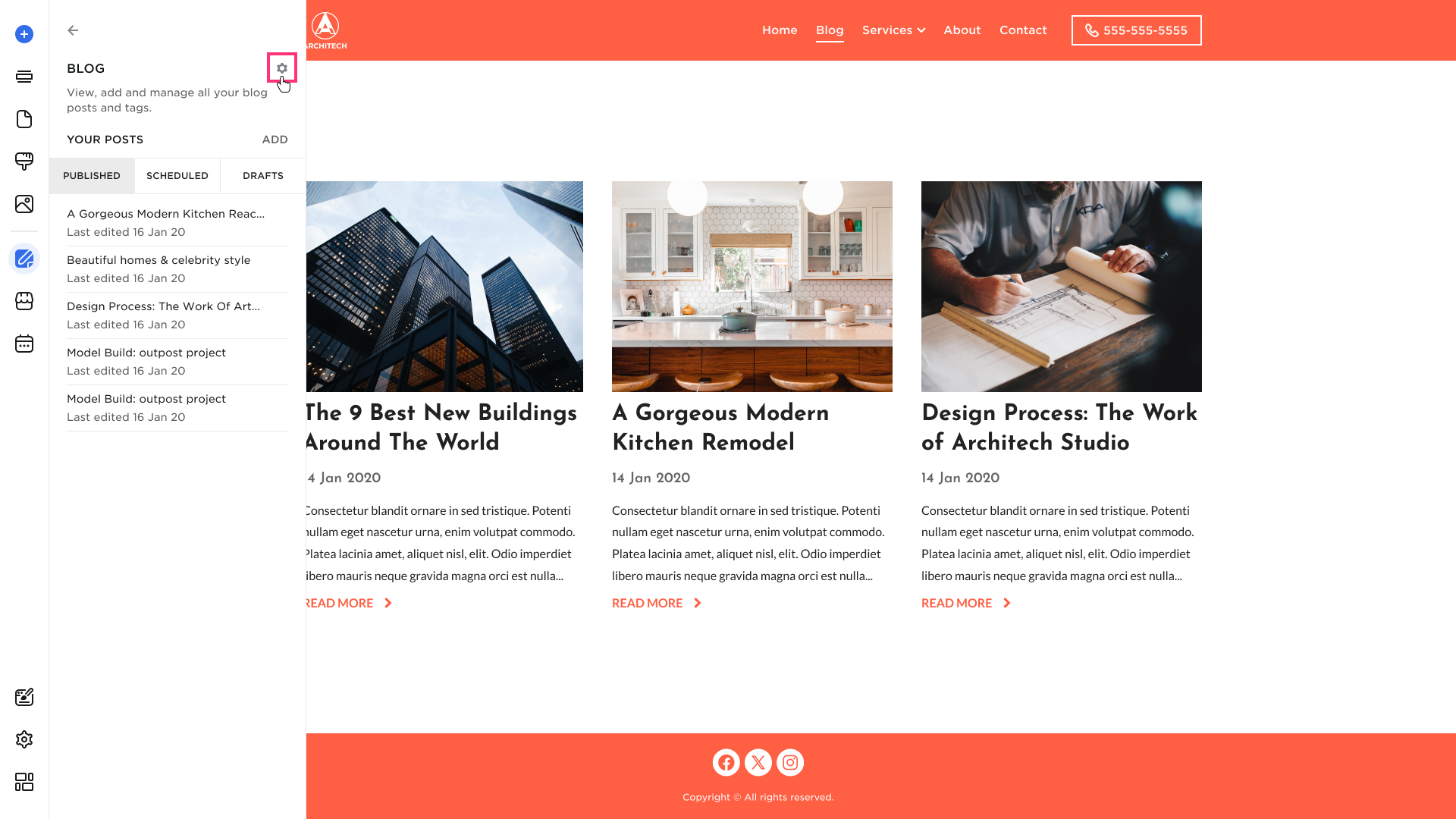 - Posts URL Format. Use the drop-down menu to choose the desired URL format for your blog posts. Once selected, the URL format example will appear in the drop-down: