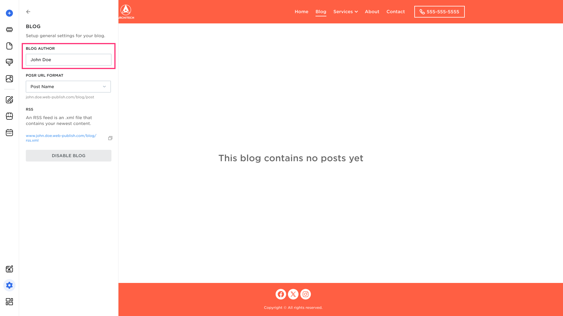 - Blog Author. Set the Blog Author's name that will appear in the metadata of published blog posts. This field is pre-populated with the default name for all blog posts: