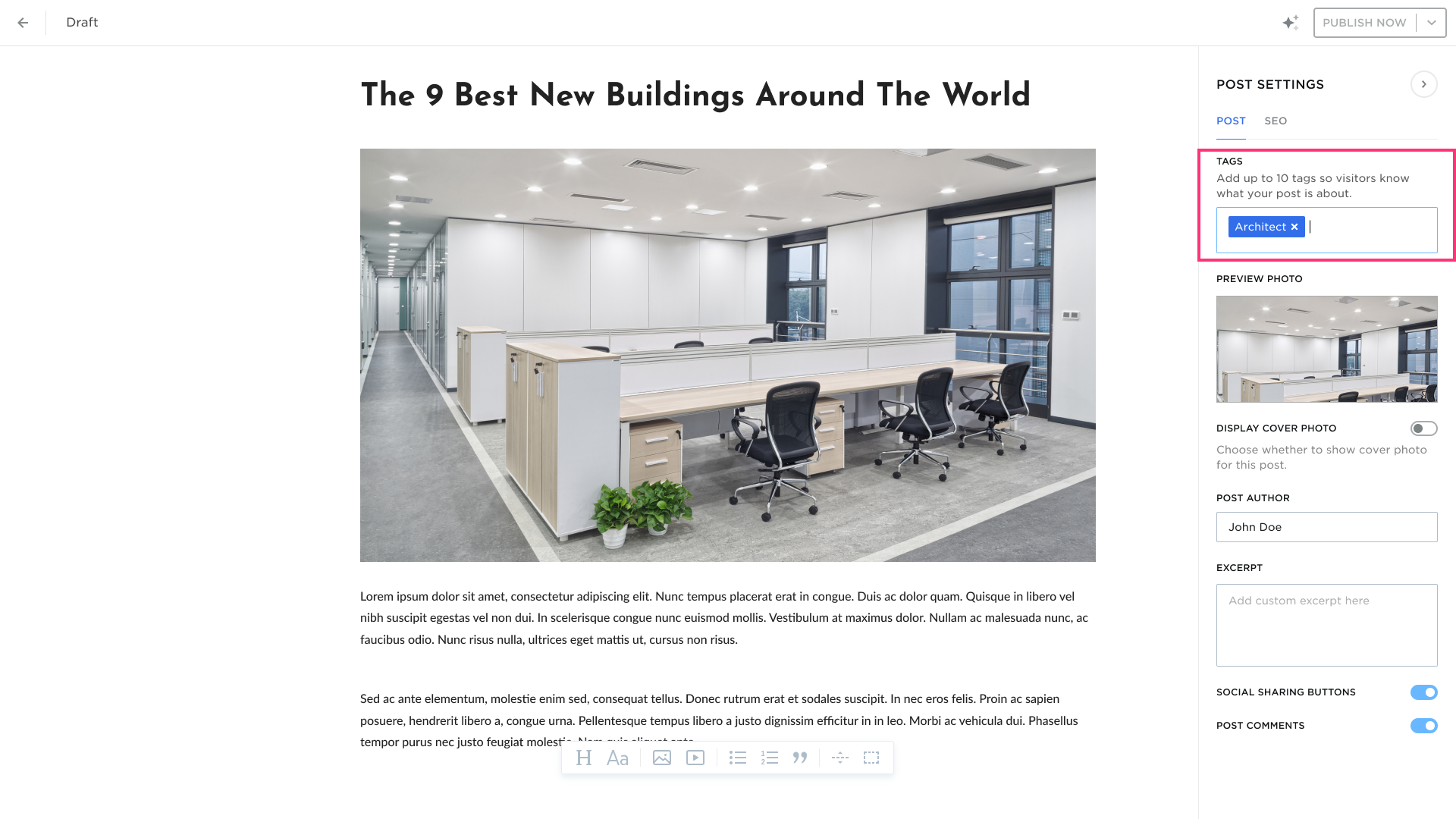 - Social Sharing Buttons. Select and turn on the Social Sharing Buttons toggle if you want to share your post.