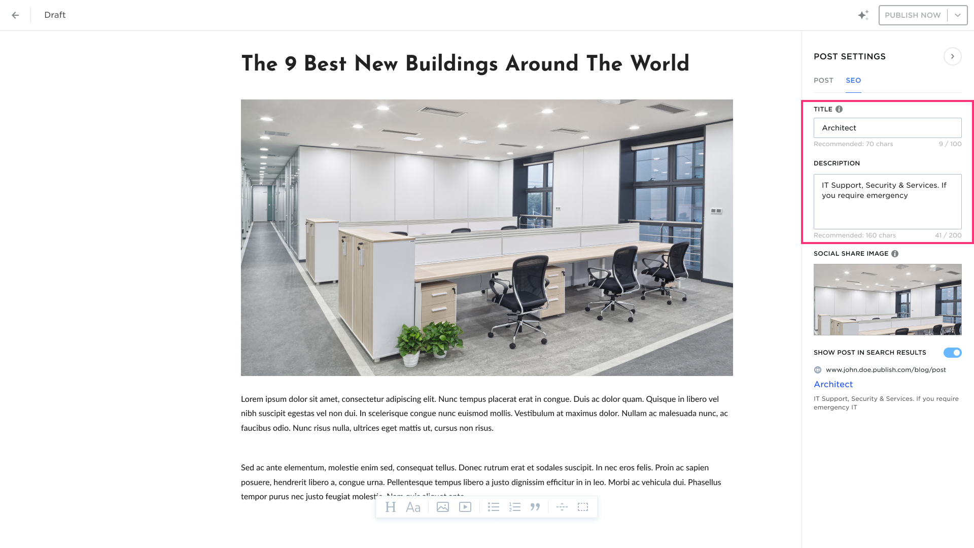 - Post Author. Change the Post Author name that will appear in the published blog post's metadata.