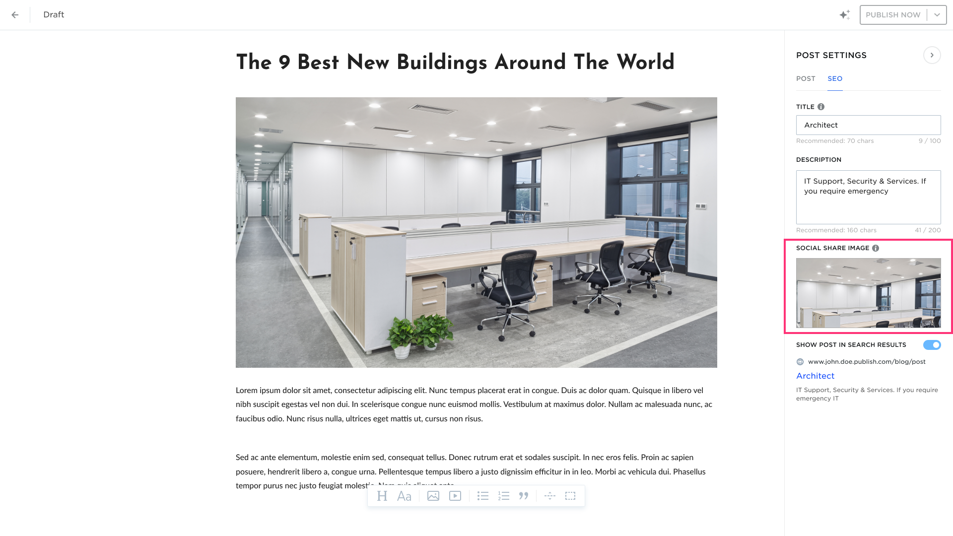 - Social Share Image: Set an image that will appear as the thumbnail when the blog post is shared on social media platforms: