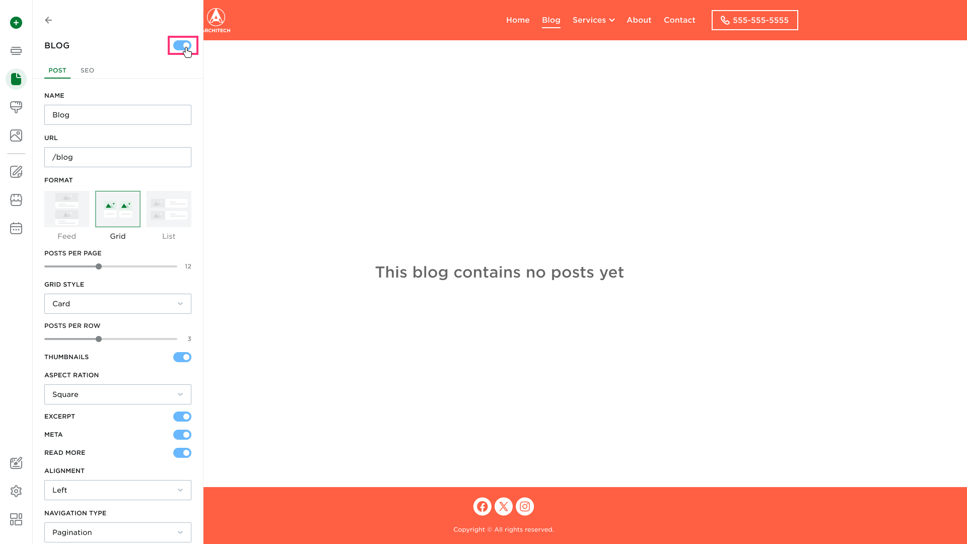 - A new Blog page will be created. It will show an empty content area until new blog posts are added.