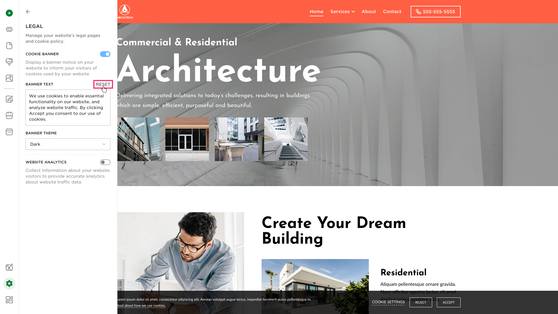 - Enable the Cookie Banner by switching the toggle. When your website goes live the banner will be shown for any visitor worldwide: