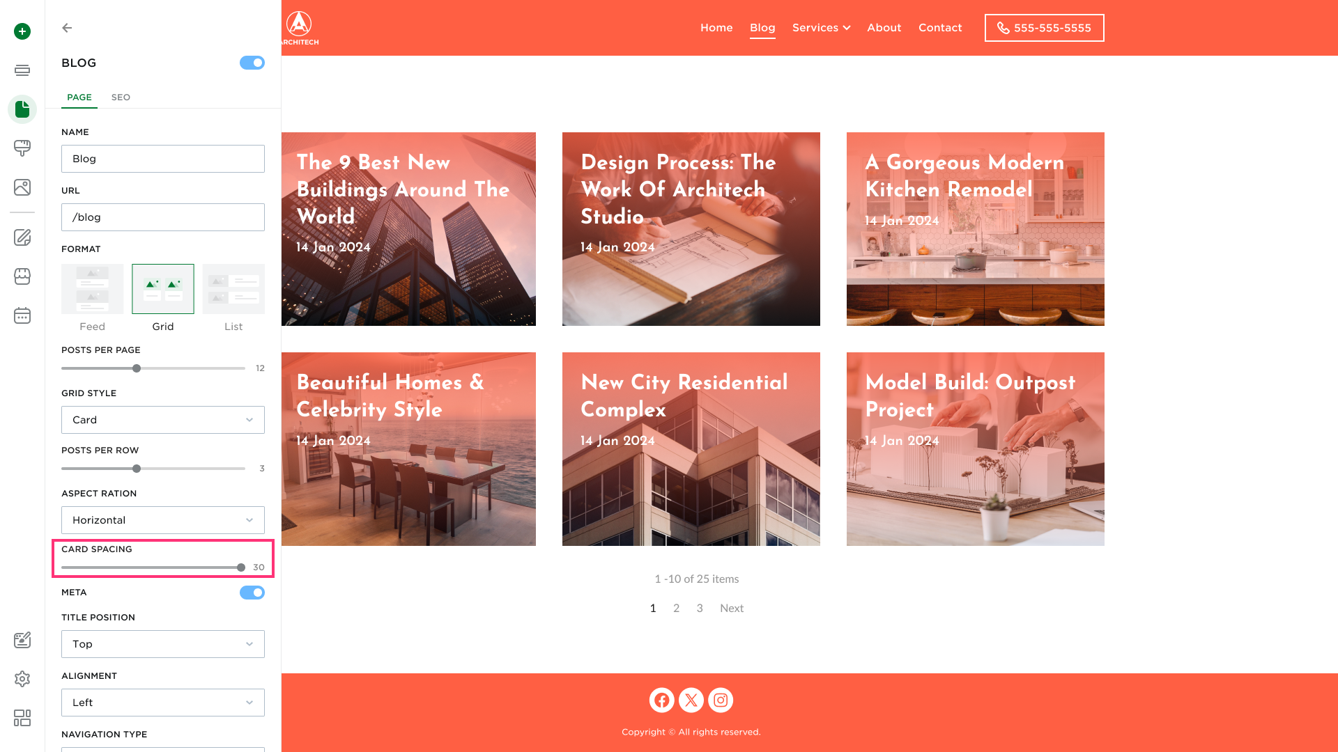 - Set the spacing between cards (posts on the page). The spacing is set to 30 by default: