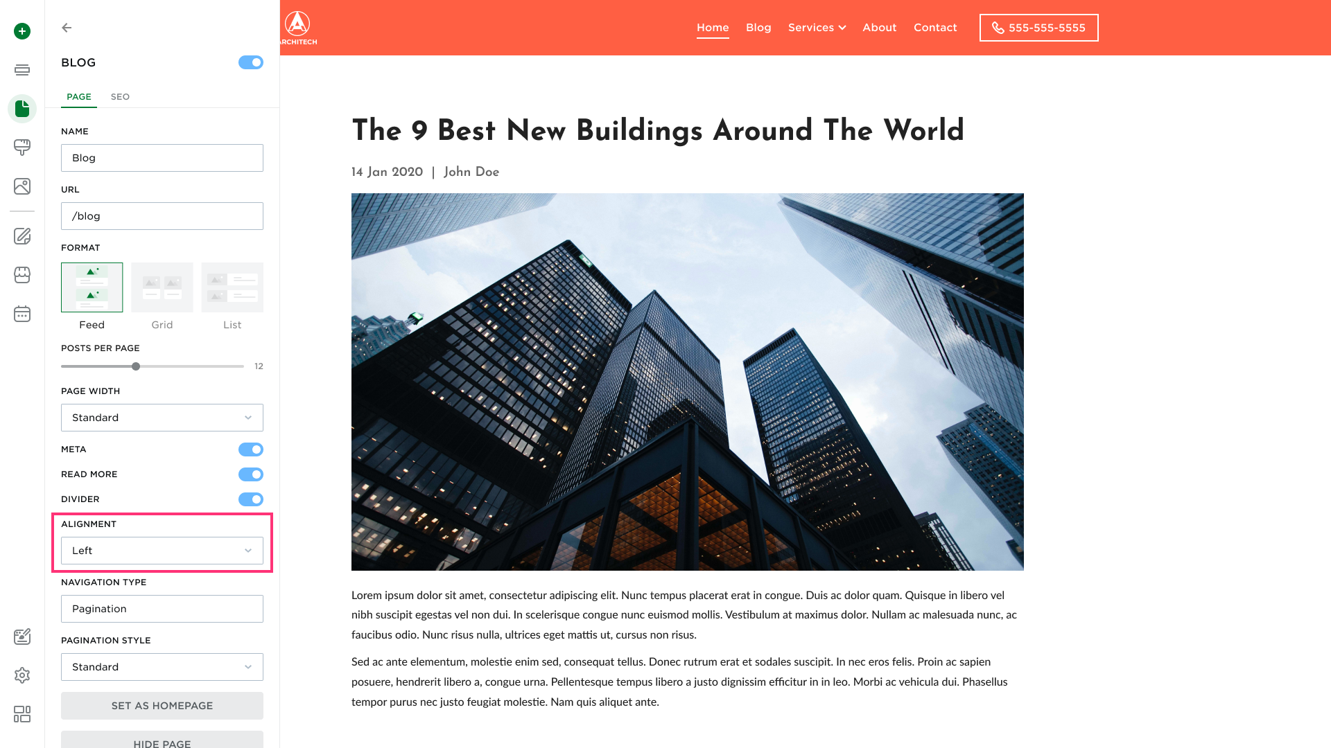 - Select the Left, Center or Right alignment from the drop-down menu. The alignment is set to the Left by default.