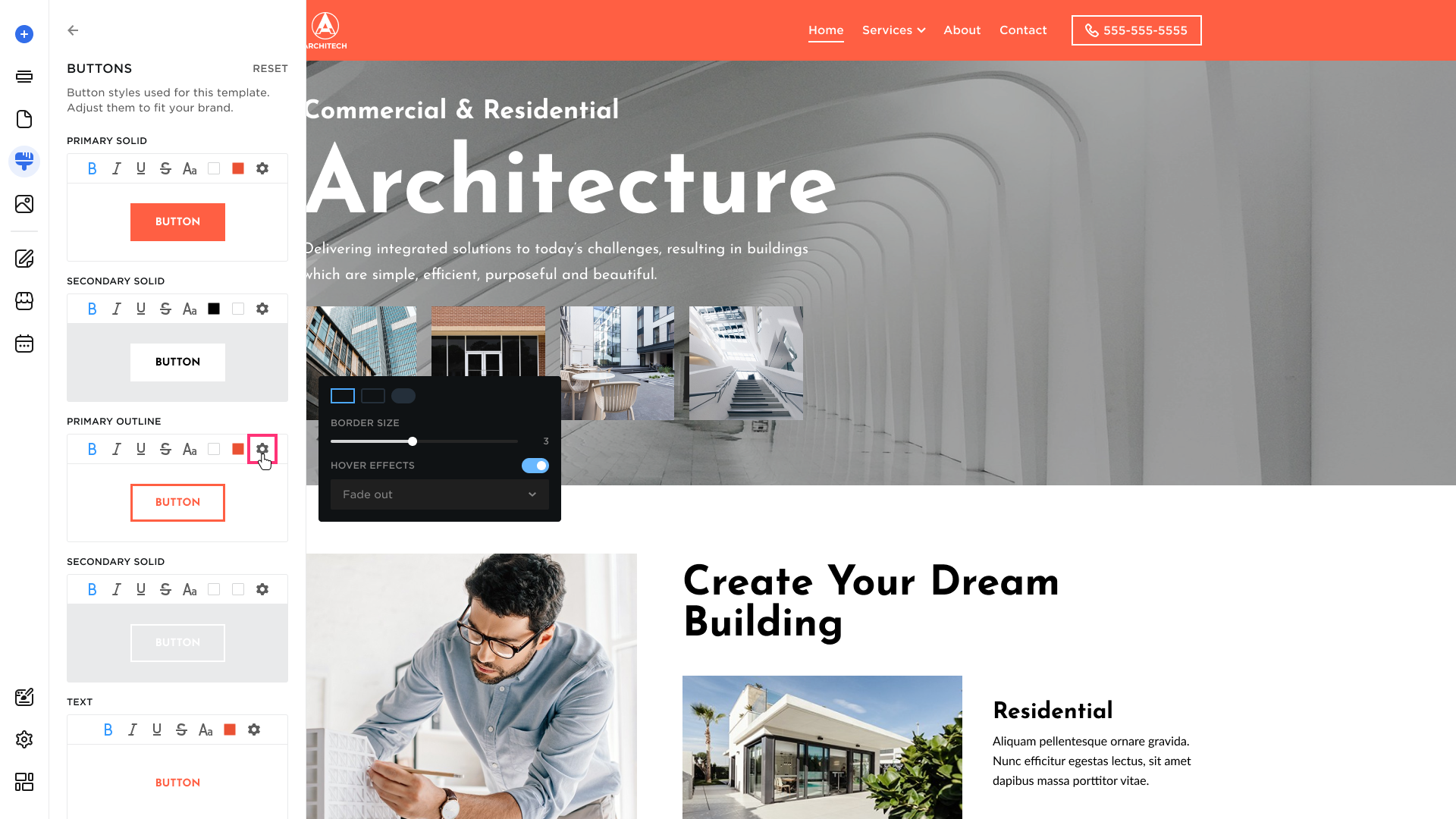 There are 5 types of Buttons in Site Editor: Primary Solid, Secondary Solid, Primary Outline, Secondary Outline, and Text.