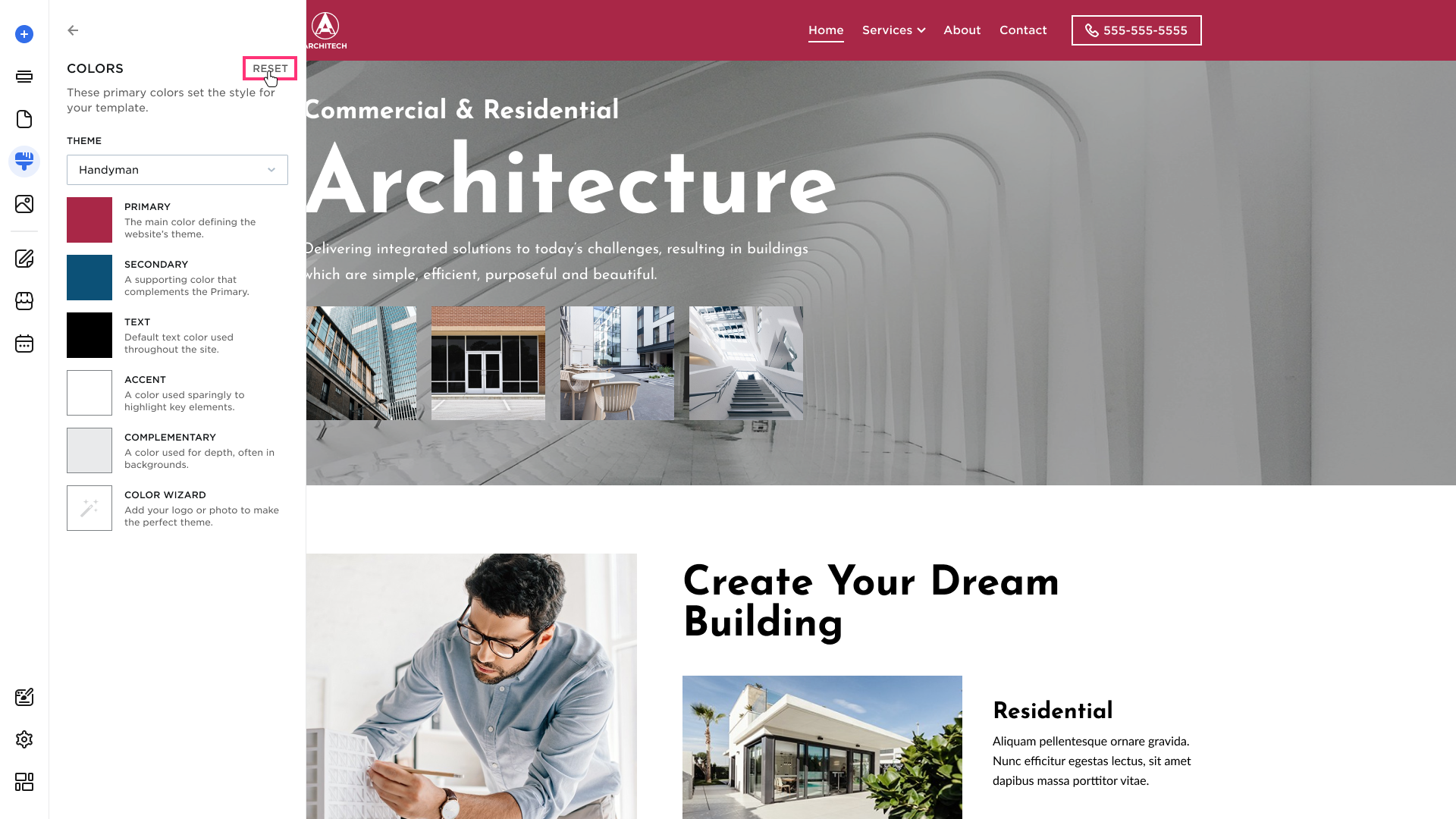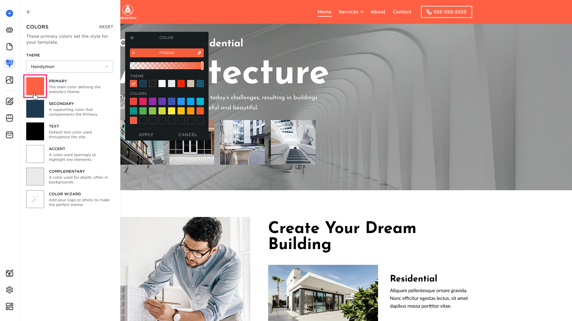 Change your website's colors to suit your brand's style! Each template has a professionally designed color theme by default, but you can easily customize each color or switch between themes. These color settings are global and will be applied to all website pages.
