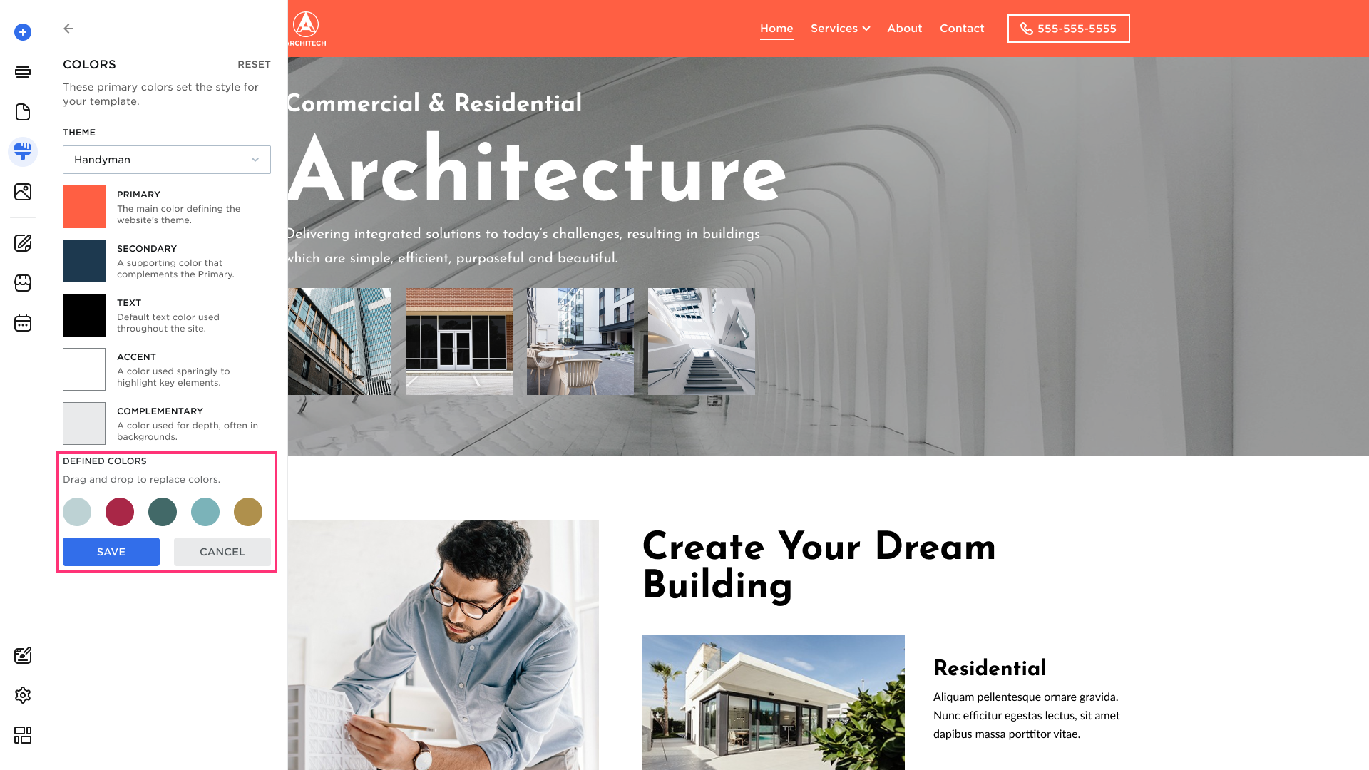 - Click Save after replacing the colors. The new colors will be applied throughout your website.