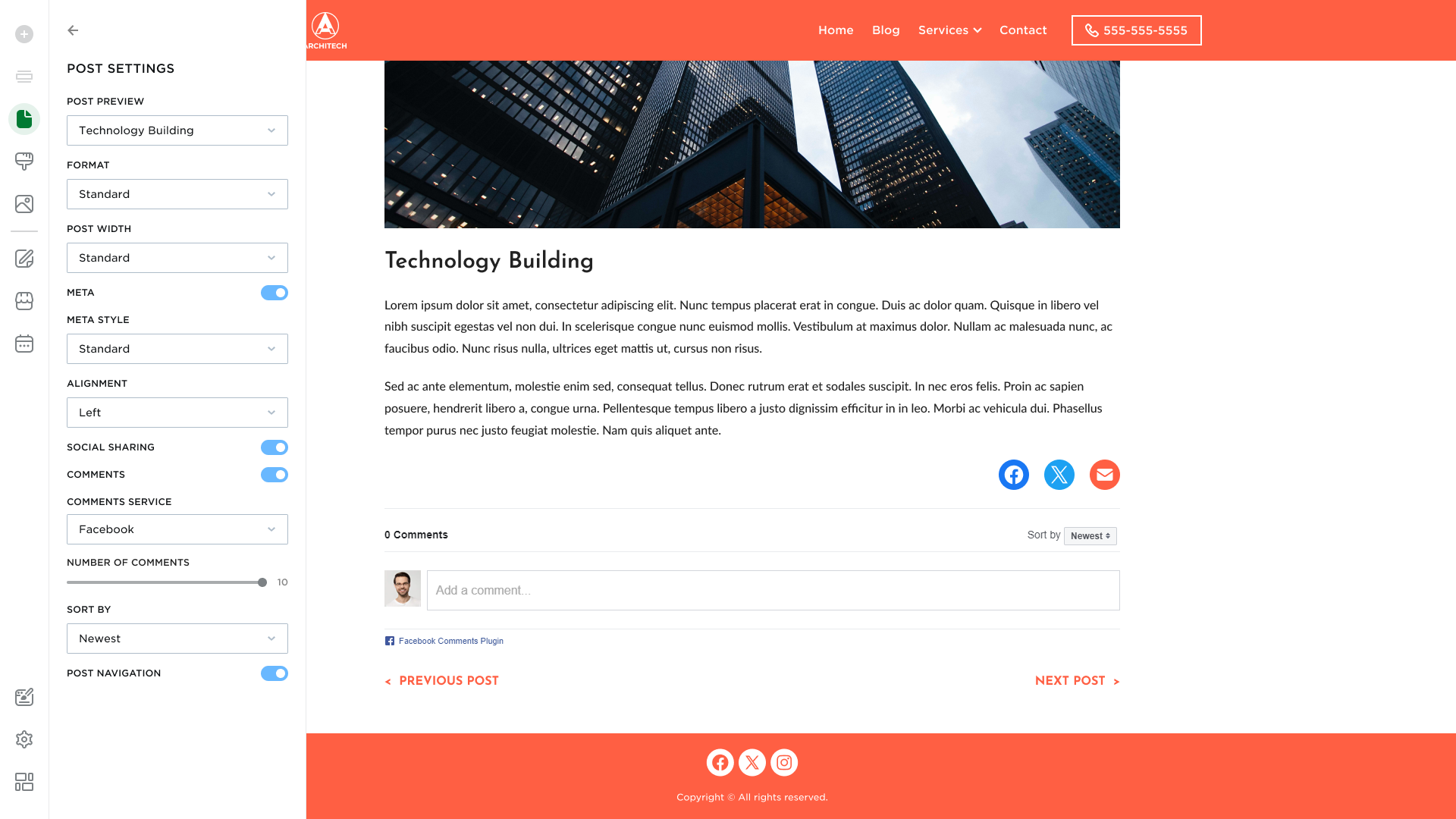 - Enable the Social Sharing option for your blog posts by turning on the switch.