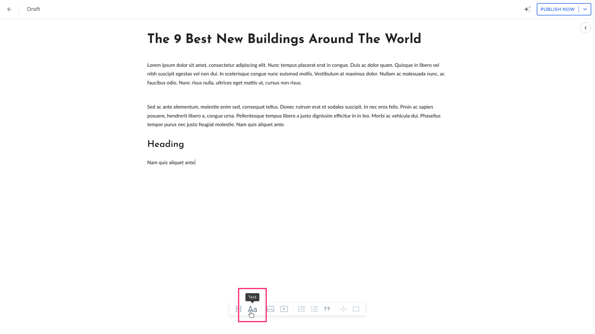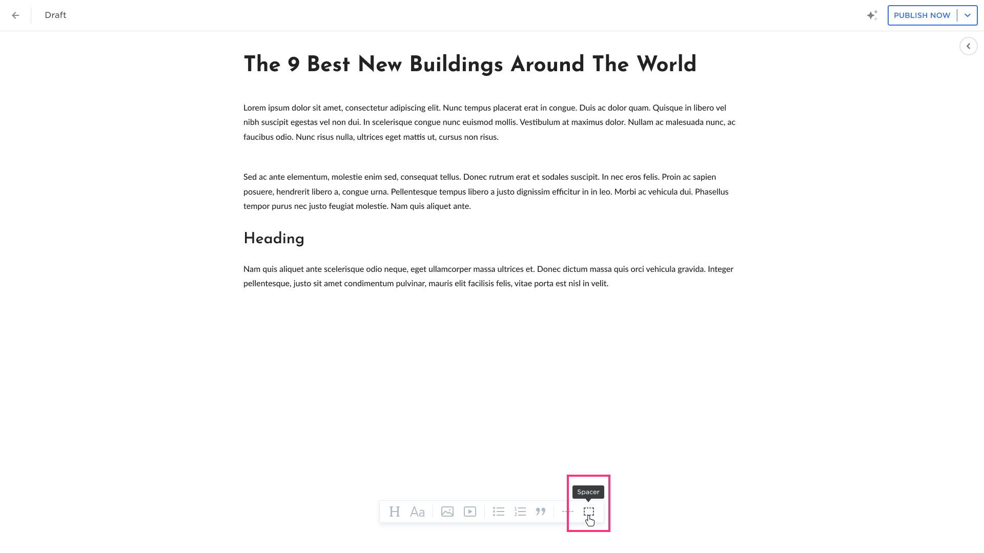 - Click the H button on the toolbar to add a Heading: