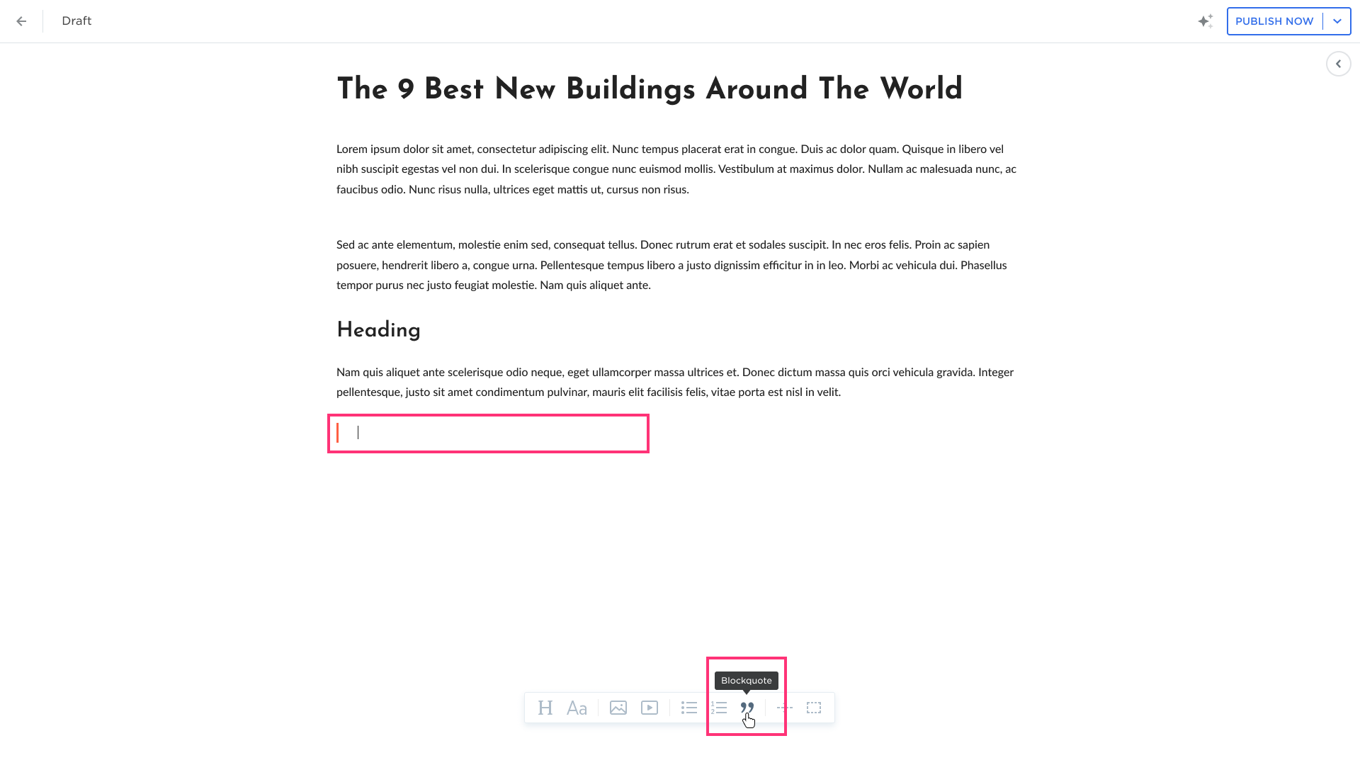 - Add and modify the Blockquote using the toolbar settings: