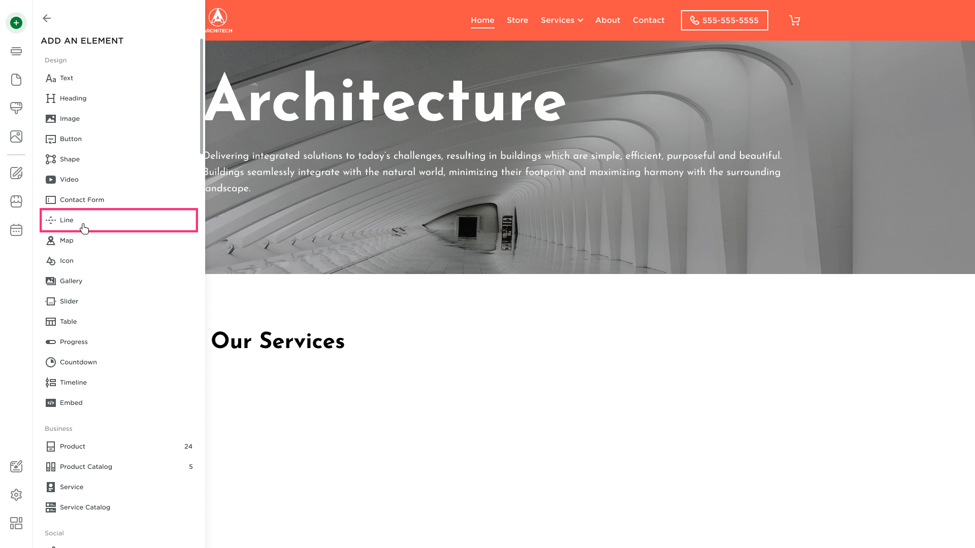 A Line is a horizontal line element that can be added between other elements on a webpage to visually separate content. It can be placed within any section and between sections.