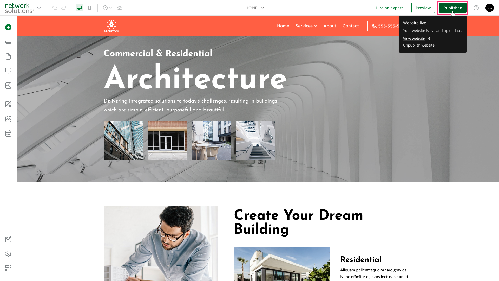 - The Publish button will be changed to Published once a site is published. You can hover over the Publish button to View website or Unpublish it: