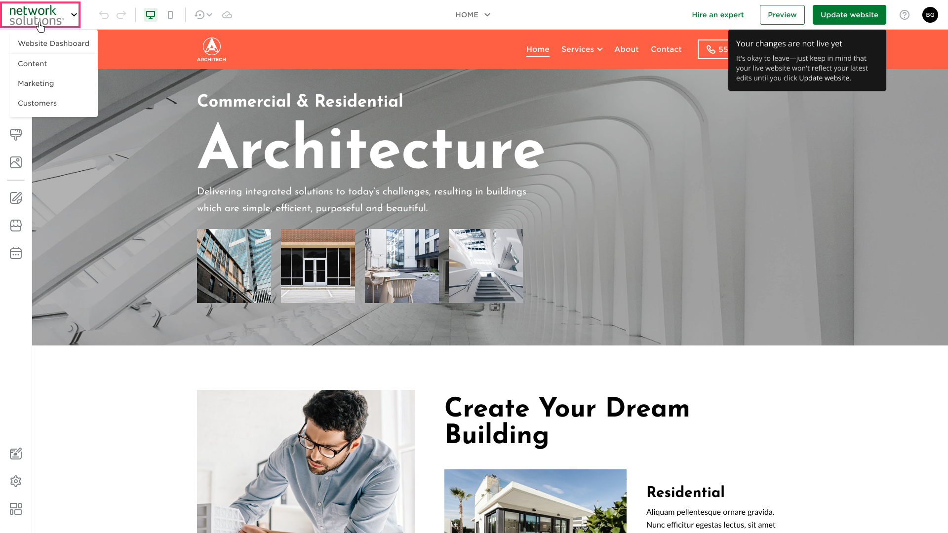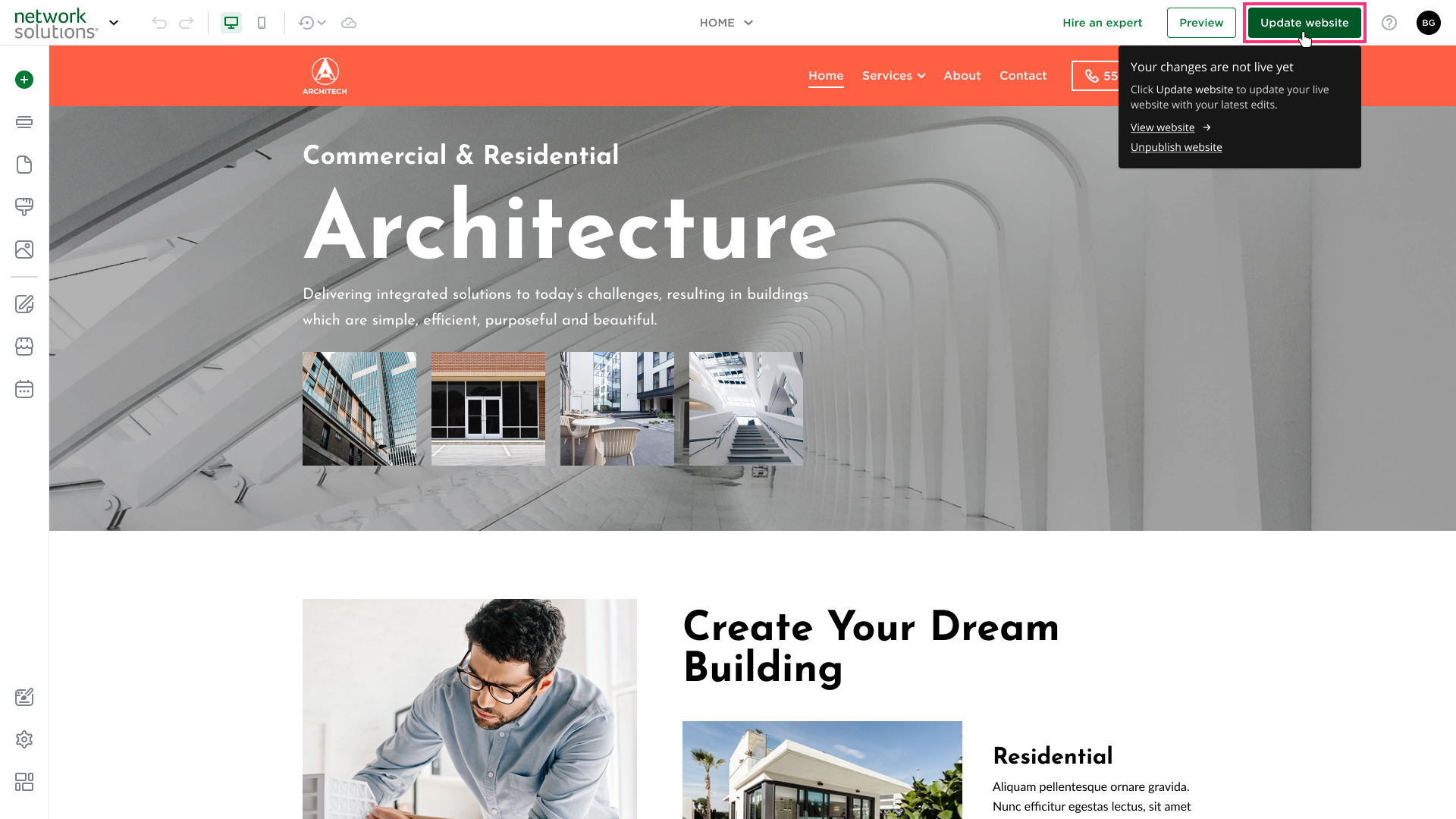 - After you make any unpublished changes, the Published button will be changed to Update Website. You can hover over the Update Website button to View website or Unpublish it: