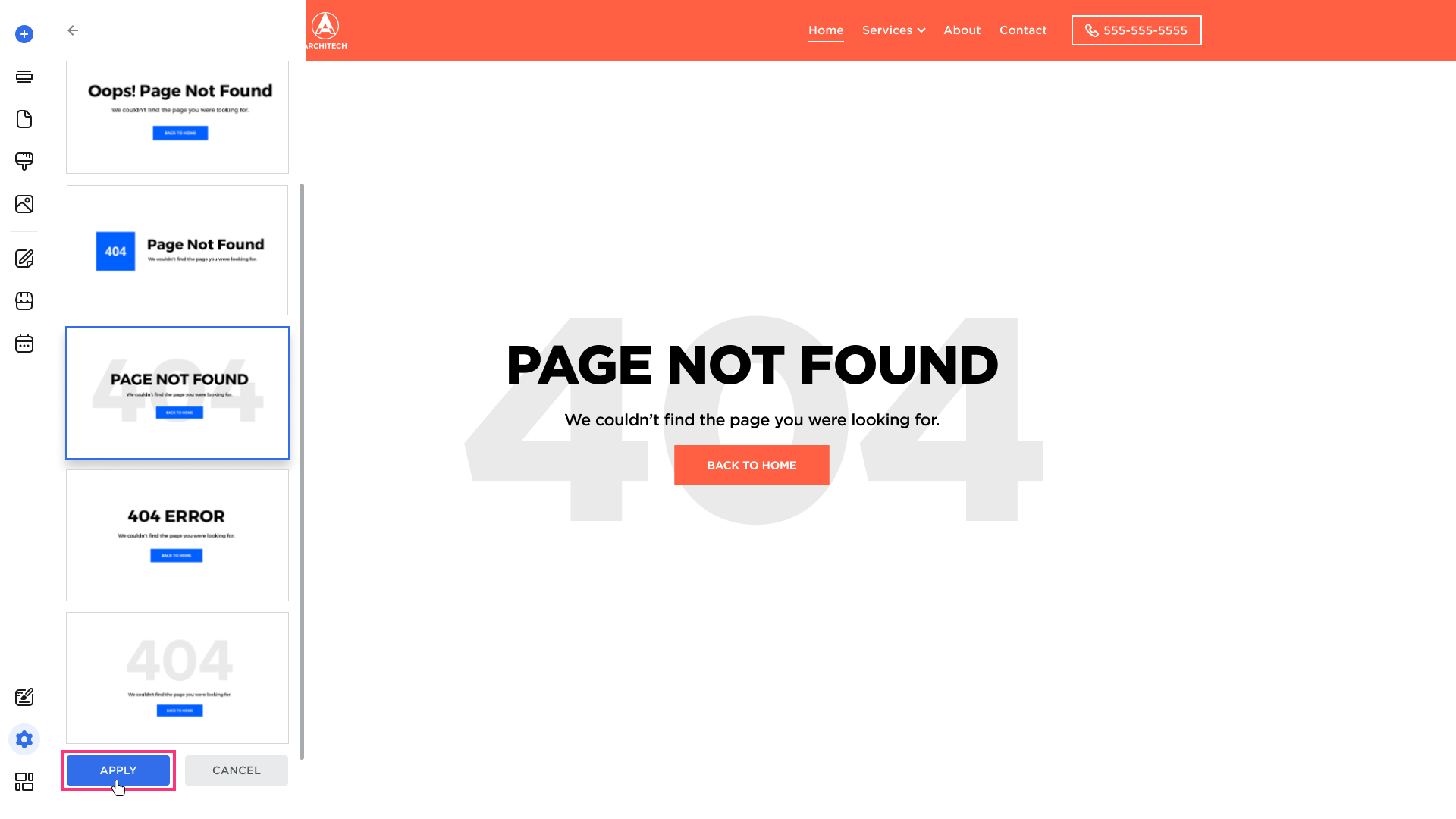 - Select Apply button at the very bottom of the template list. The new 404 Error Page will immediately replace the default version.