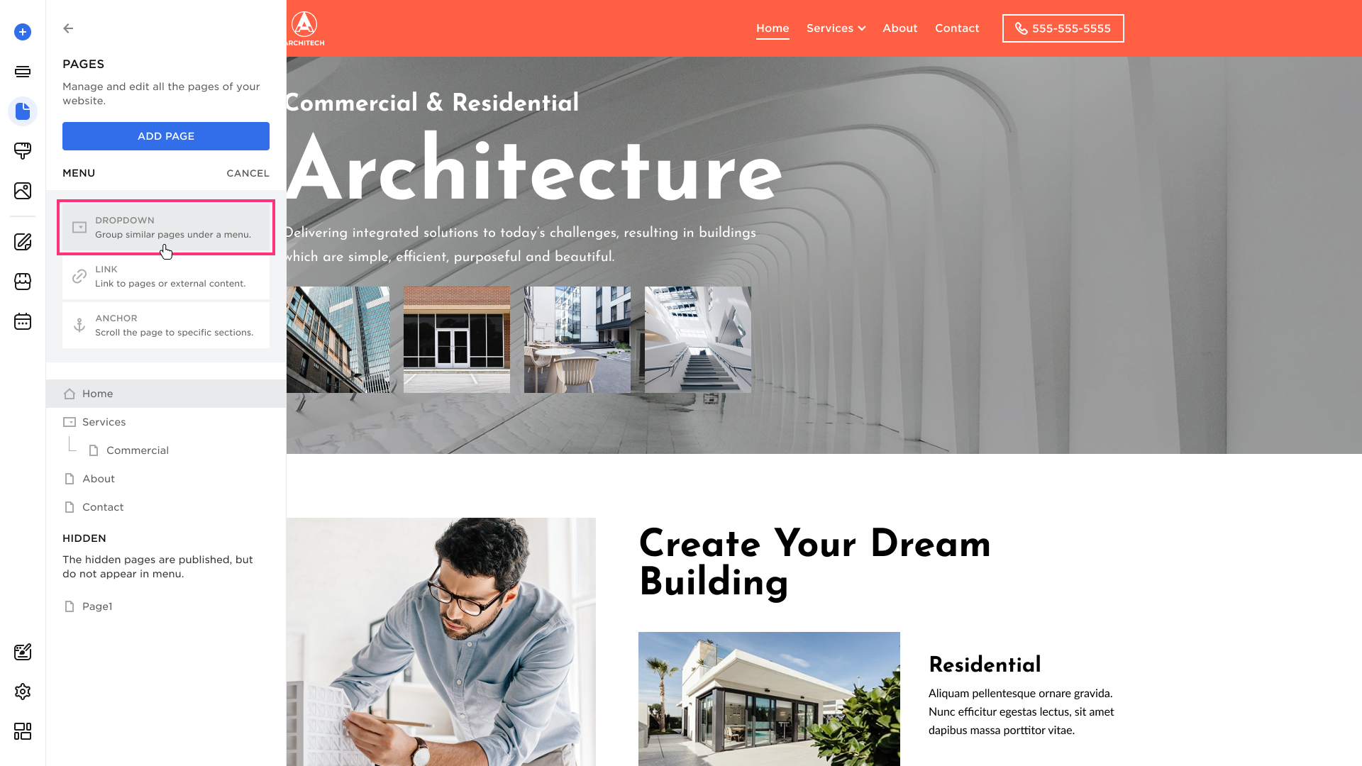 You can add a Dropdown to your Pages to manage your website's structure. A Dropdown is a non-clickable item of the Navigation Menu that groups pages and links as its sub-items.