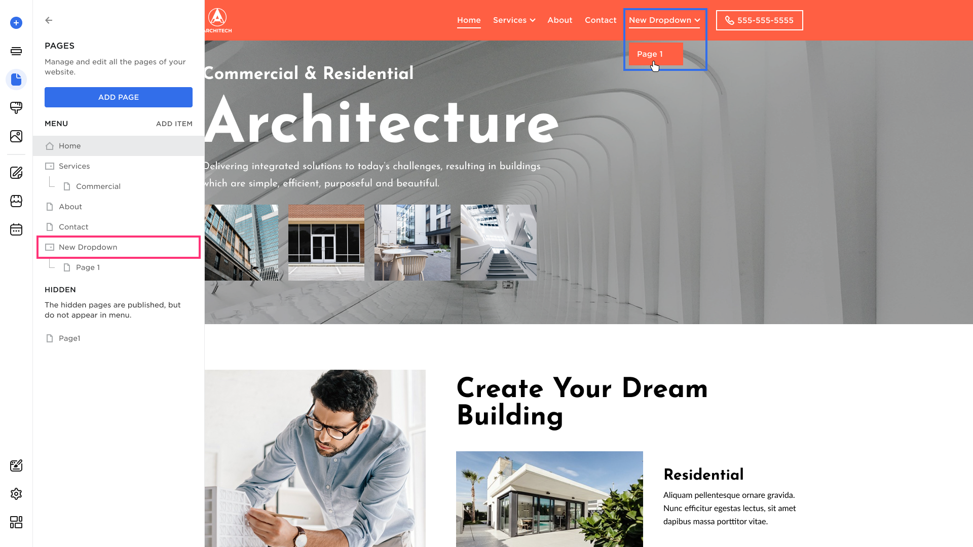 - The Dropdown will immediately appear in the Navigation Menu and the Menu section in Pages: