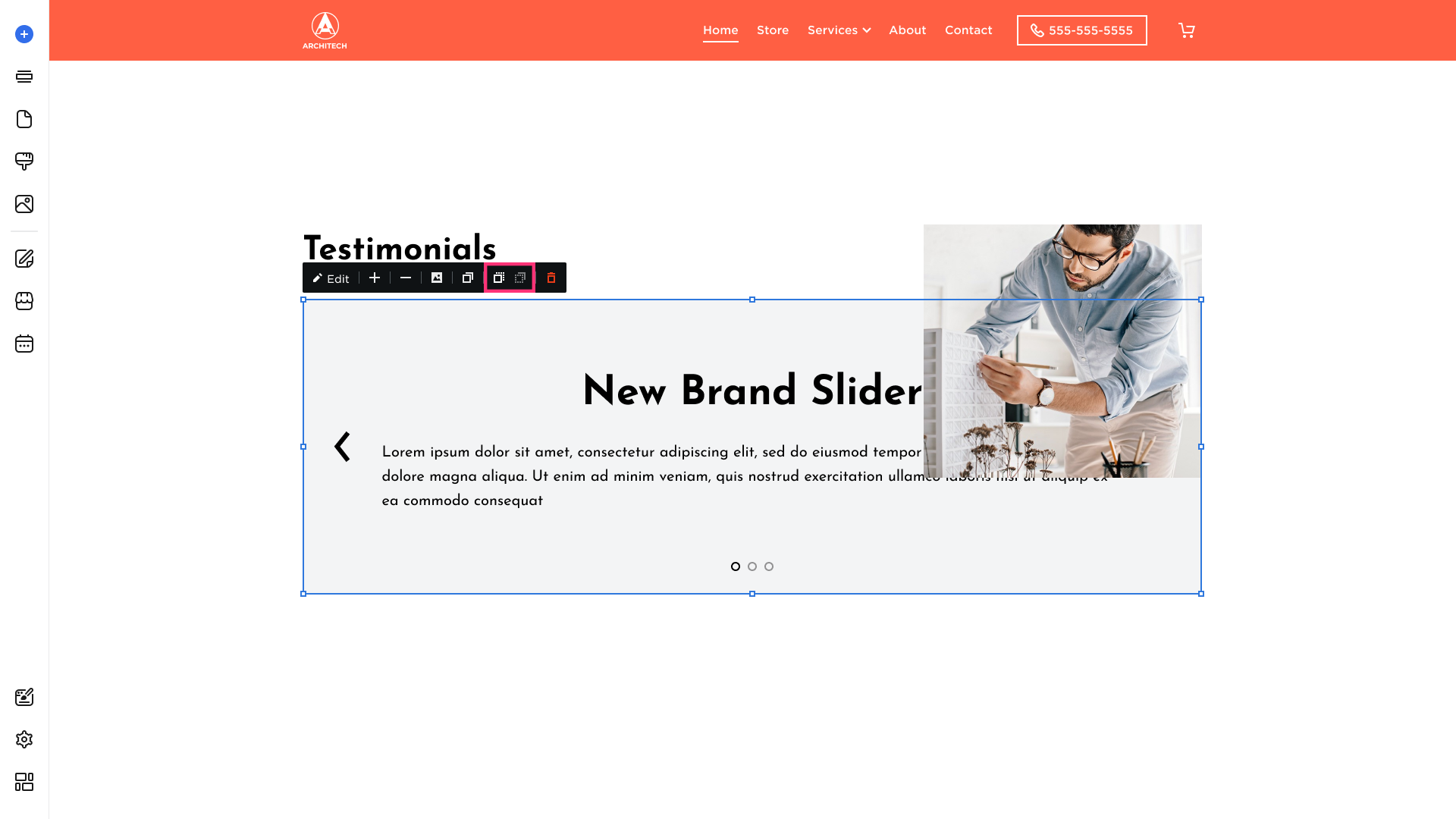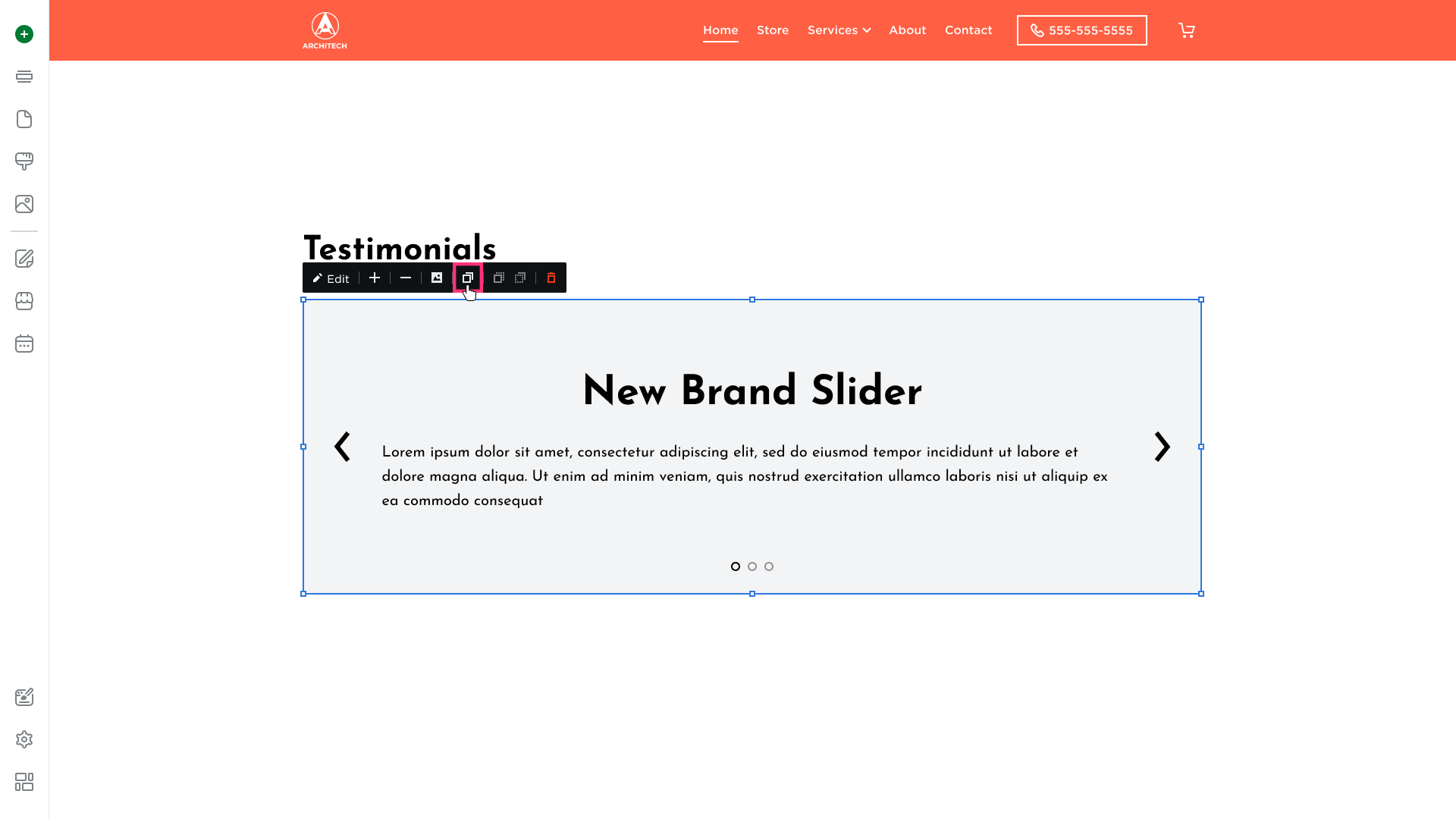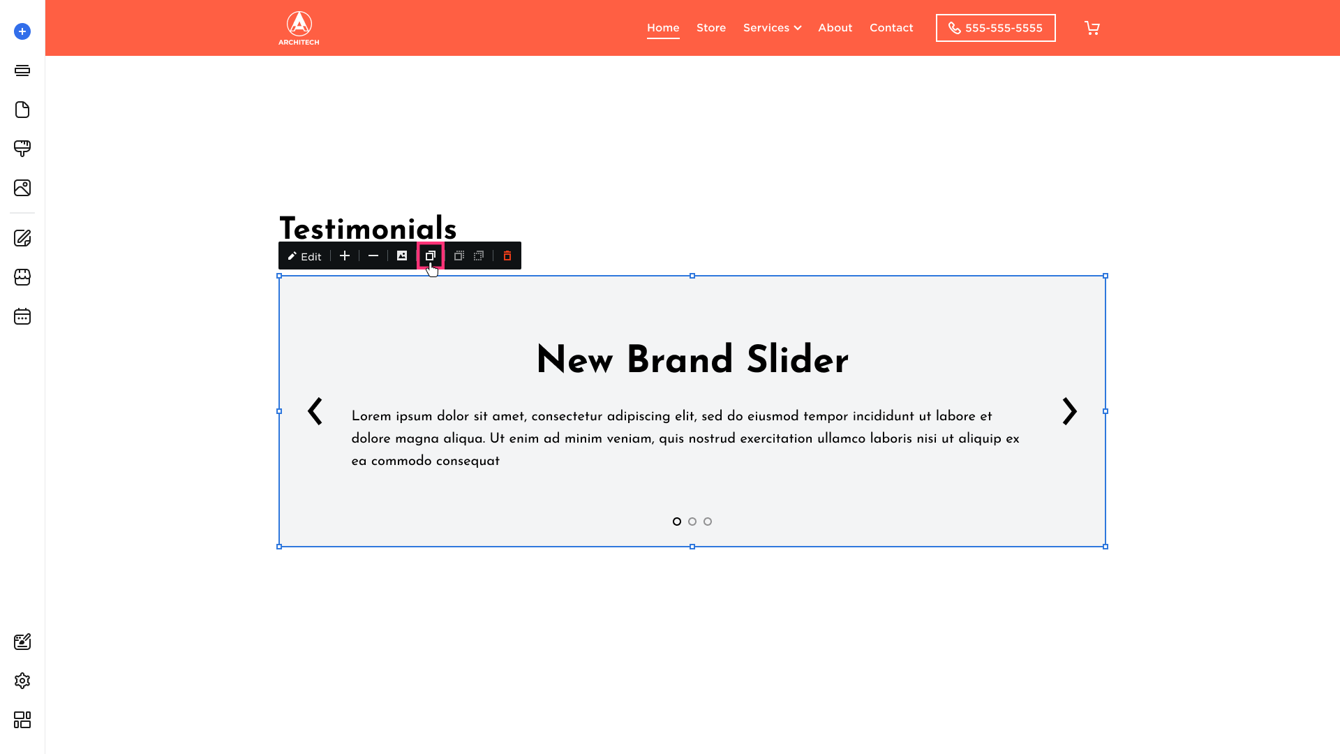 - To duplicate the slider, click on the element and choose the Duplicate button that appears in its toolbar: