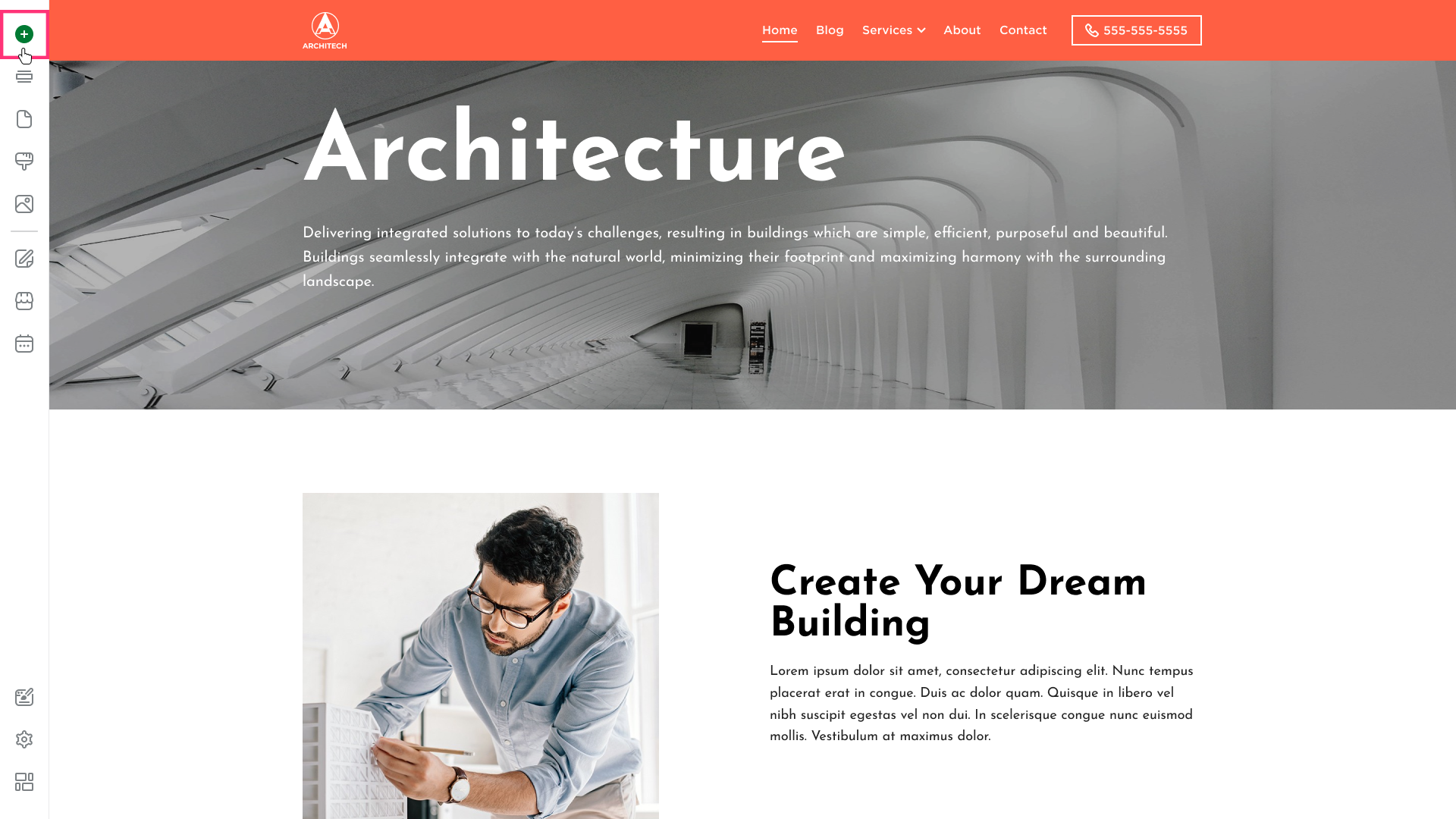 - Hover over the left sidebar of the Site Editor and click Build (+) button: