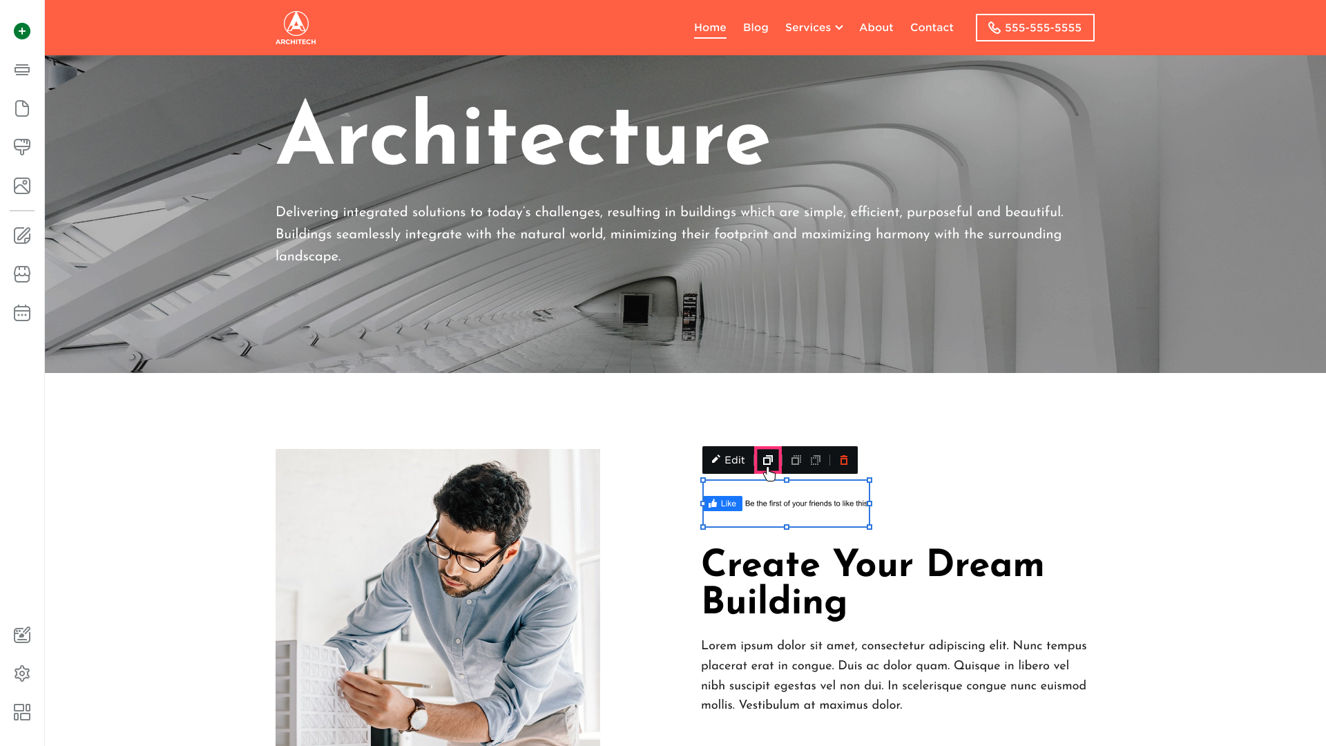 - To duplicate the Facebook Like, click on the element and choose the Duplicate button that appears in its toolbar: