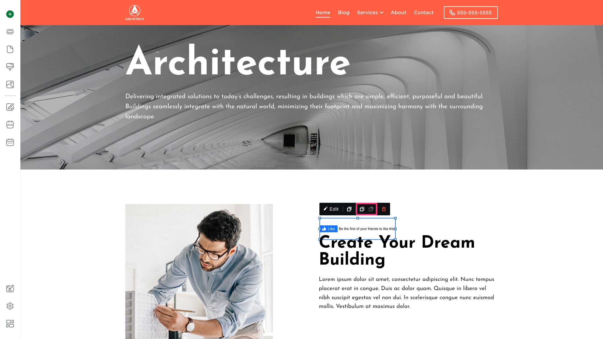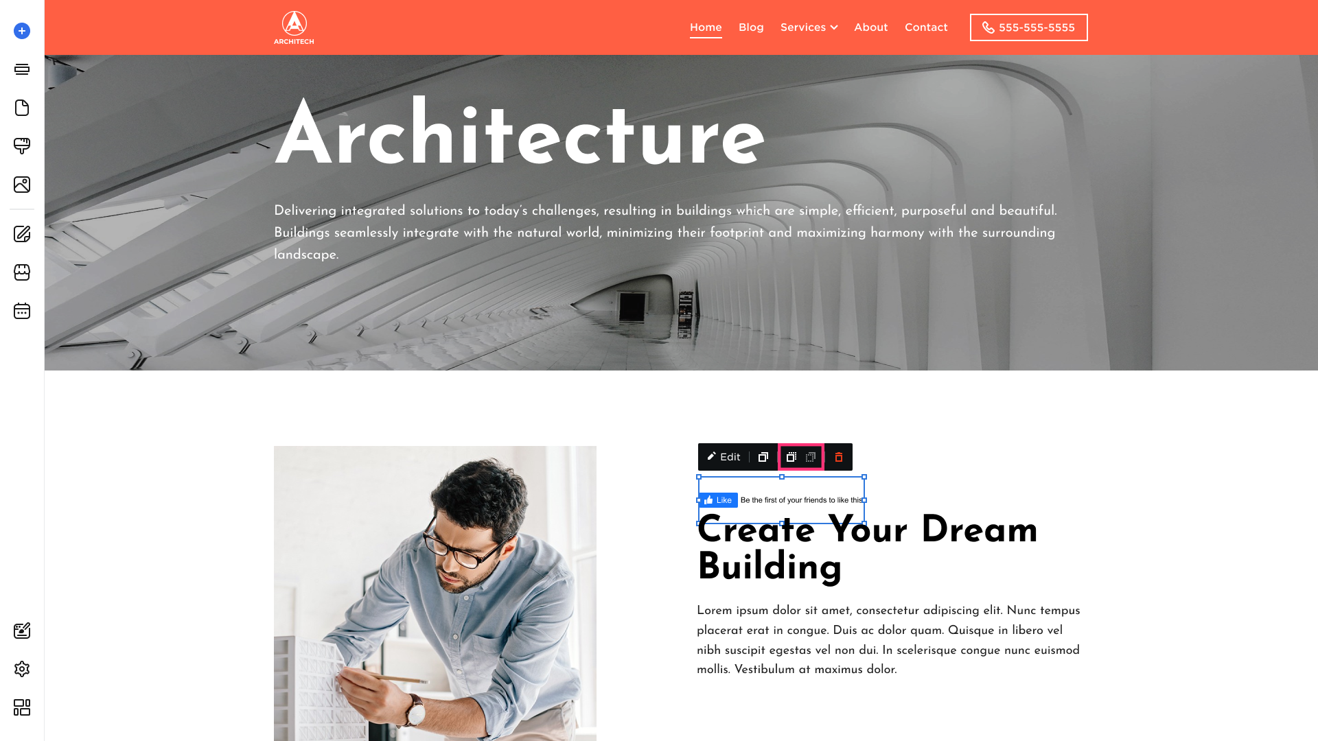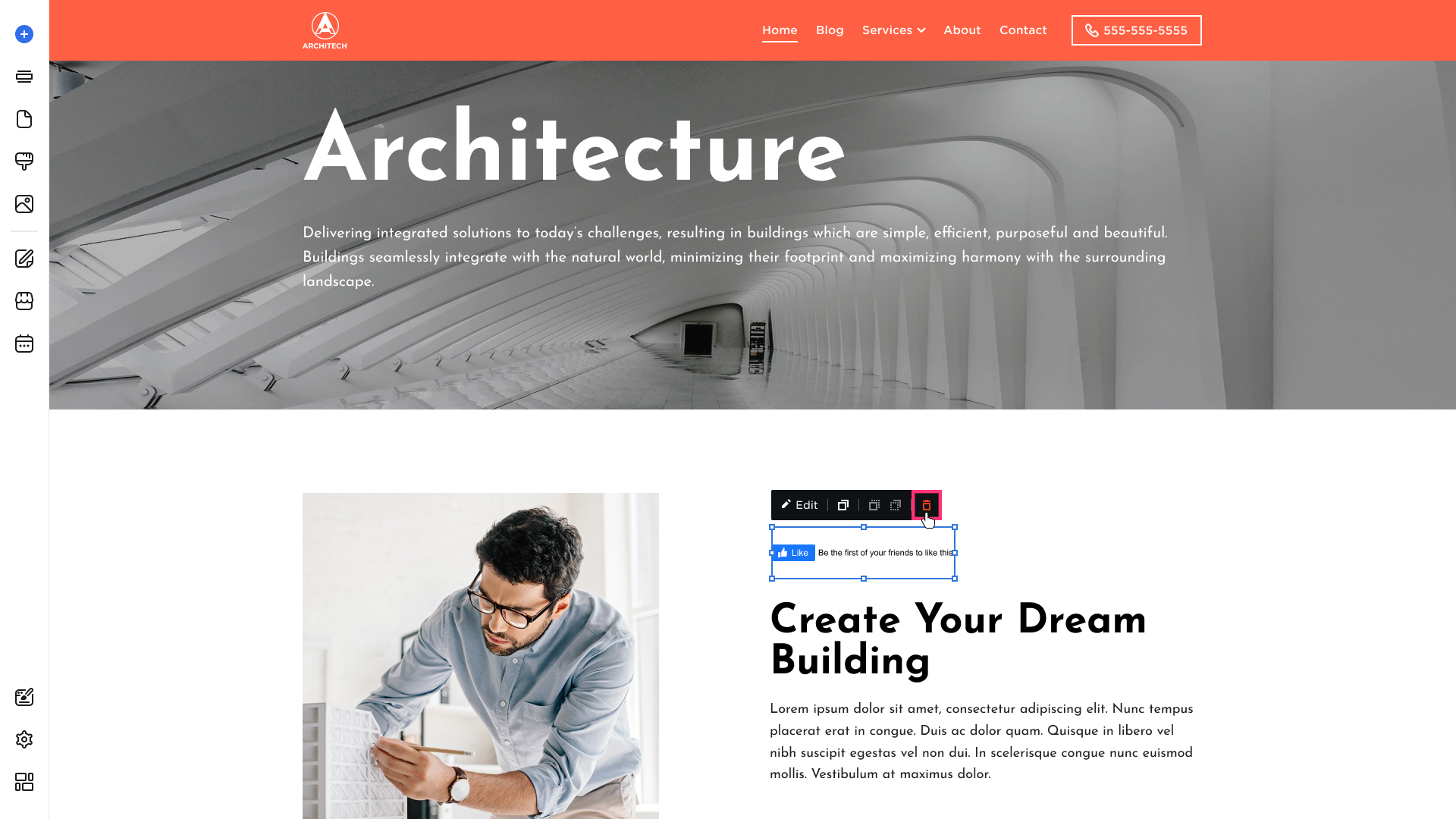 - To delete the Facebook Like, click on the element and choose the Remove button [Bin] that appears in its toolbar: