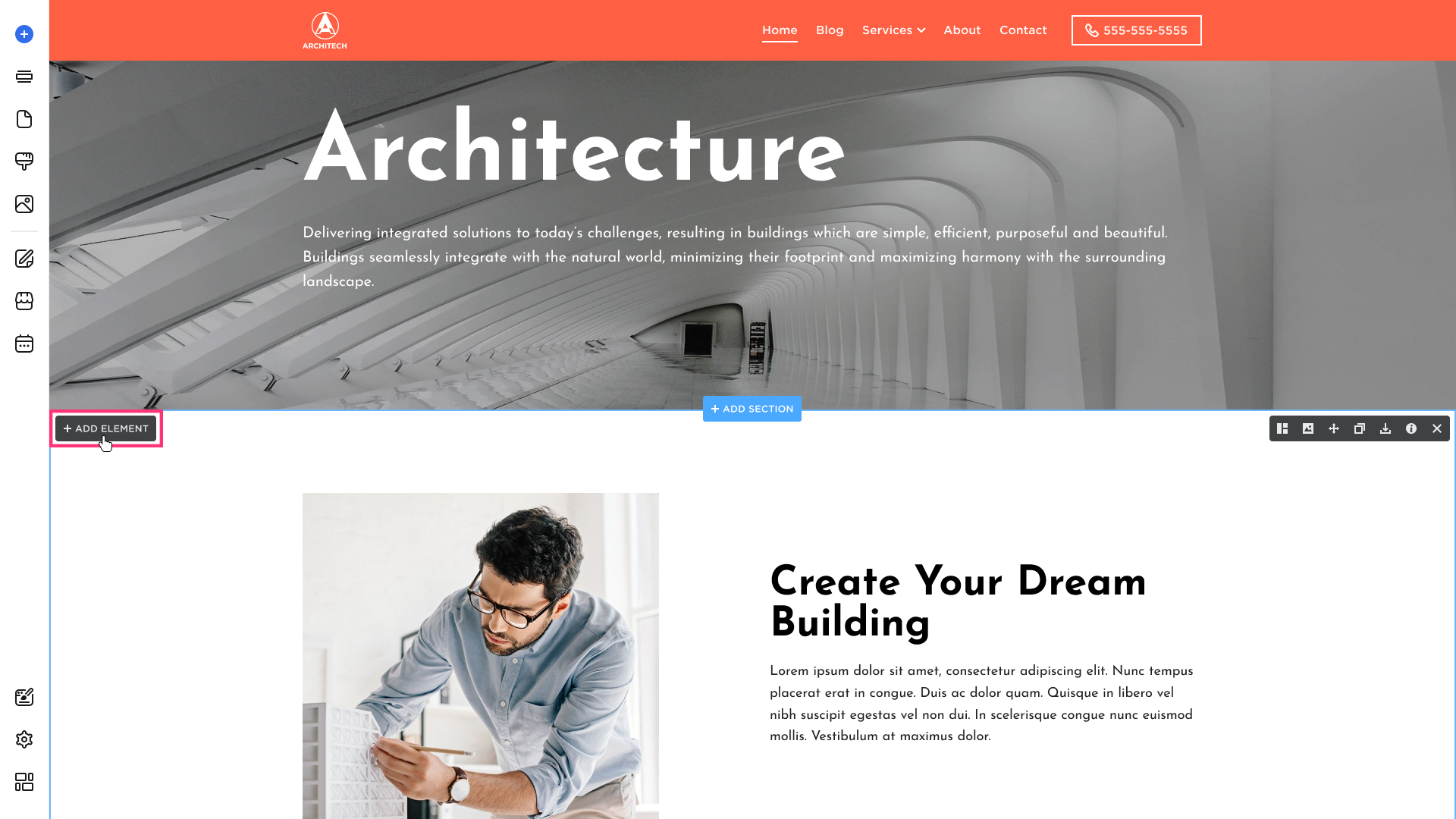 - Hover over the desired section, and click the Add Element: