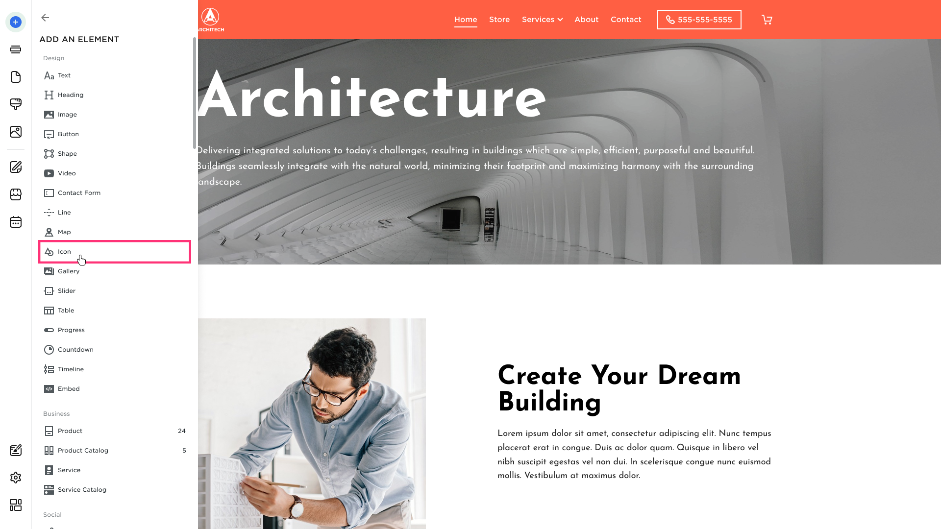 - Choose the Icon element from the modal that appears: