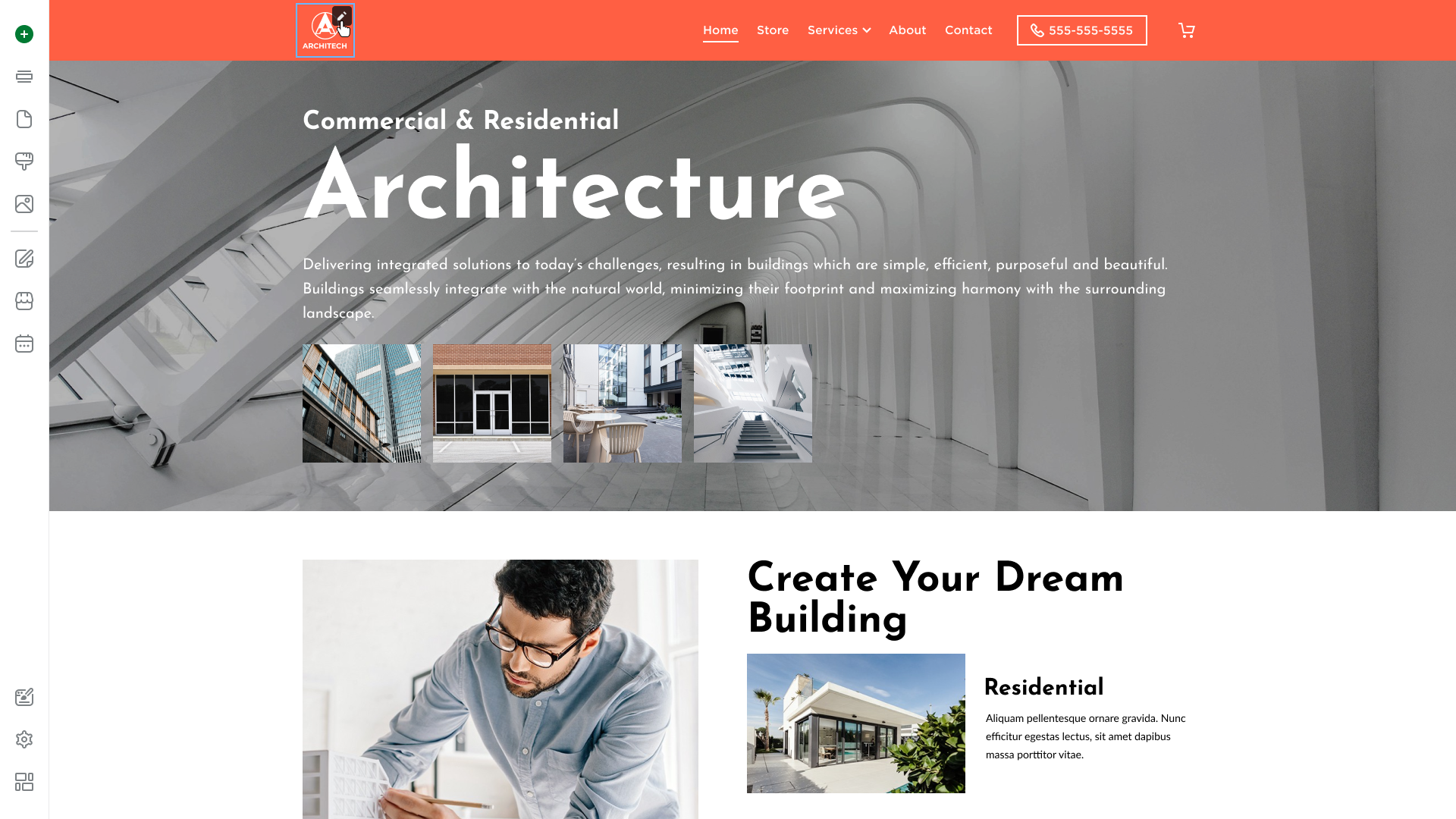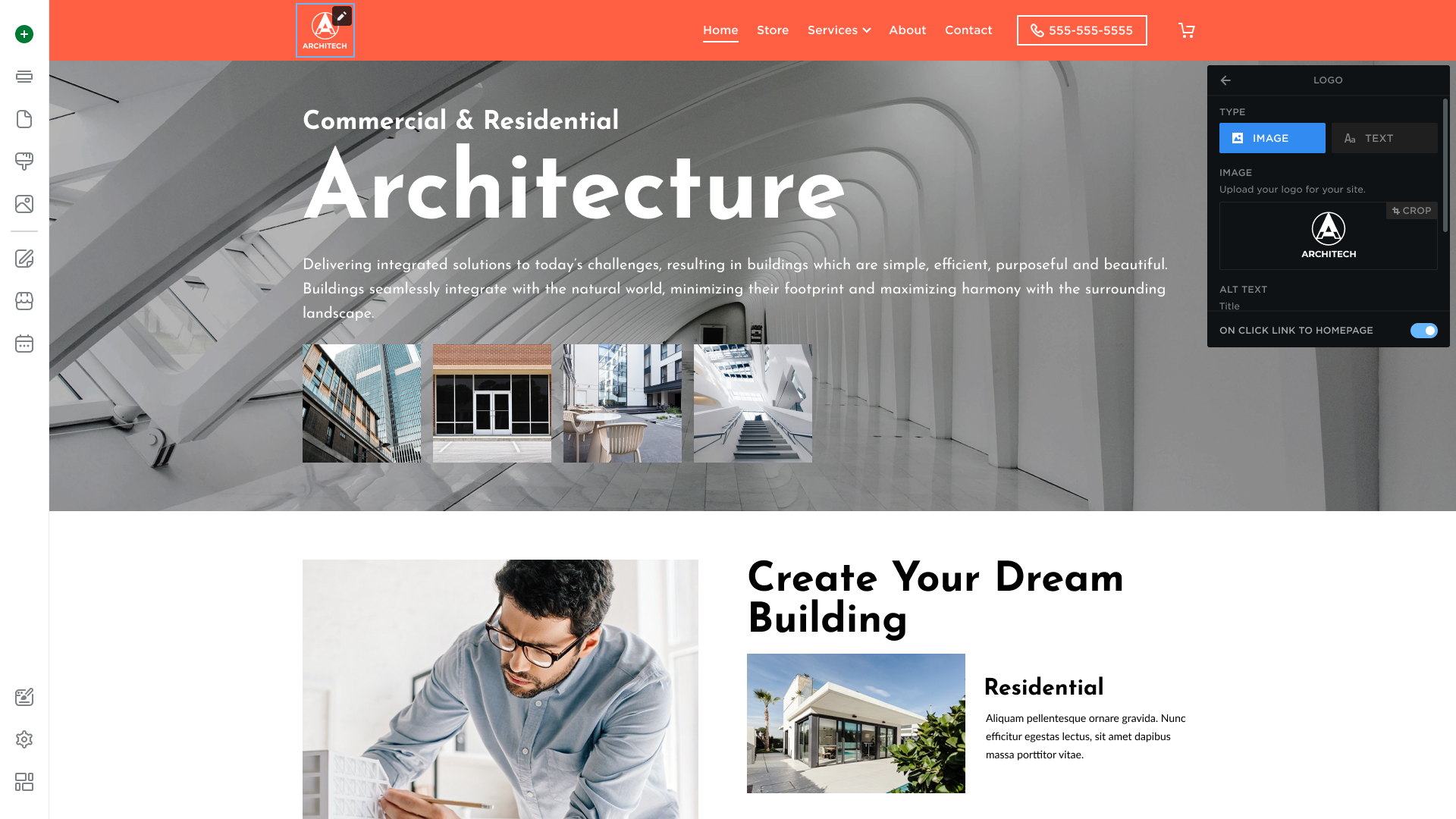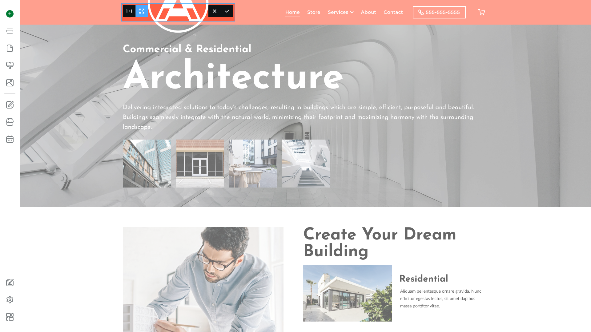 All website templates in the Site Editor already have a default logo in both the Navigation Header and Footer. You can personalize it to suit your needs with custom image or text.