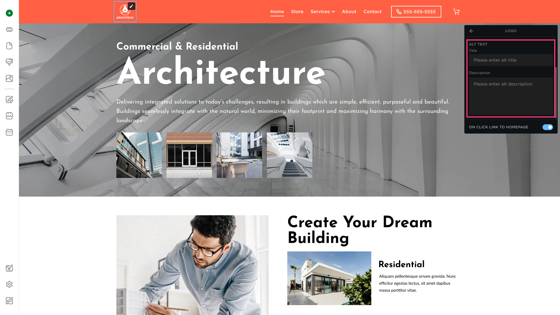 - By default, the logo is set to return your customers to the Home Page by clicking on it. But you can turn off this functionality by switching the On Click Link to Homepage toggle.
