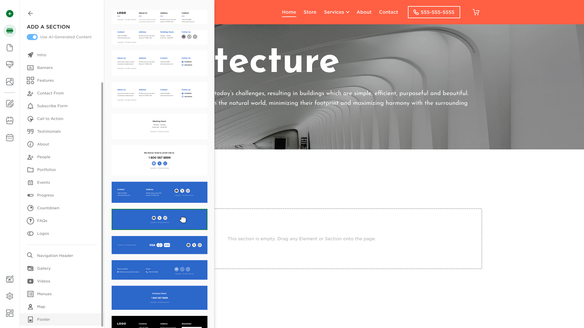 Site Editor offers a collection of ready-made Footer sections. Select a Footer section, drag it from the library, drop it onto the Footer placeholder (at the very bottom of the screen), and then configure it to suit your needs.