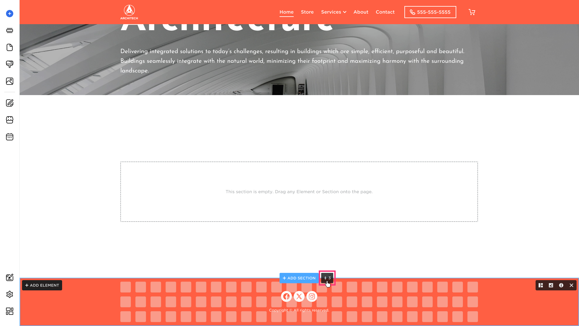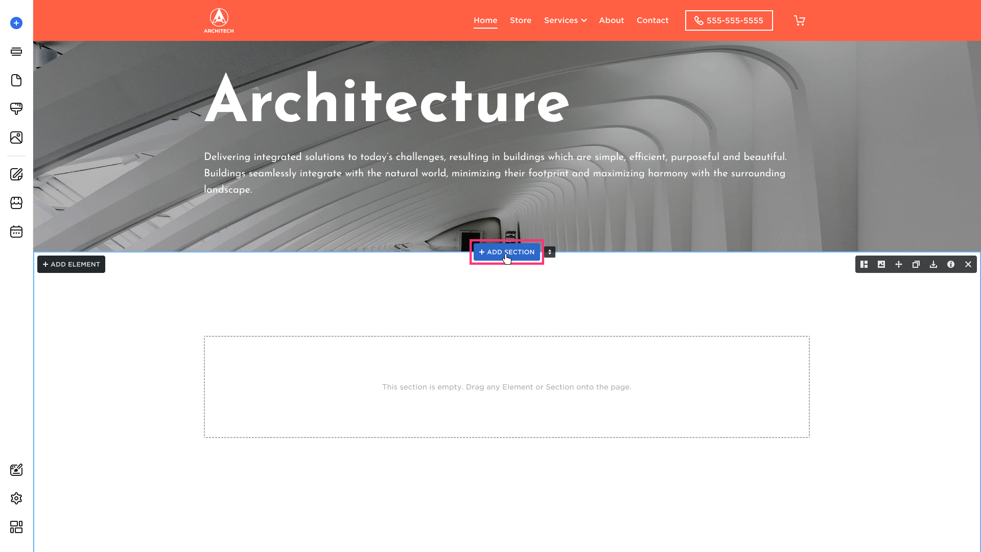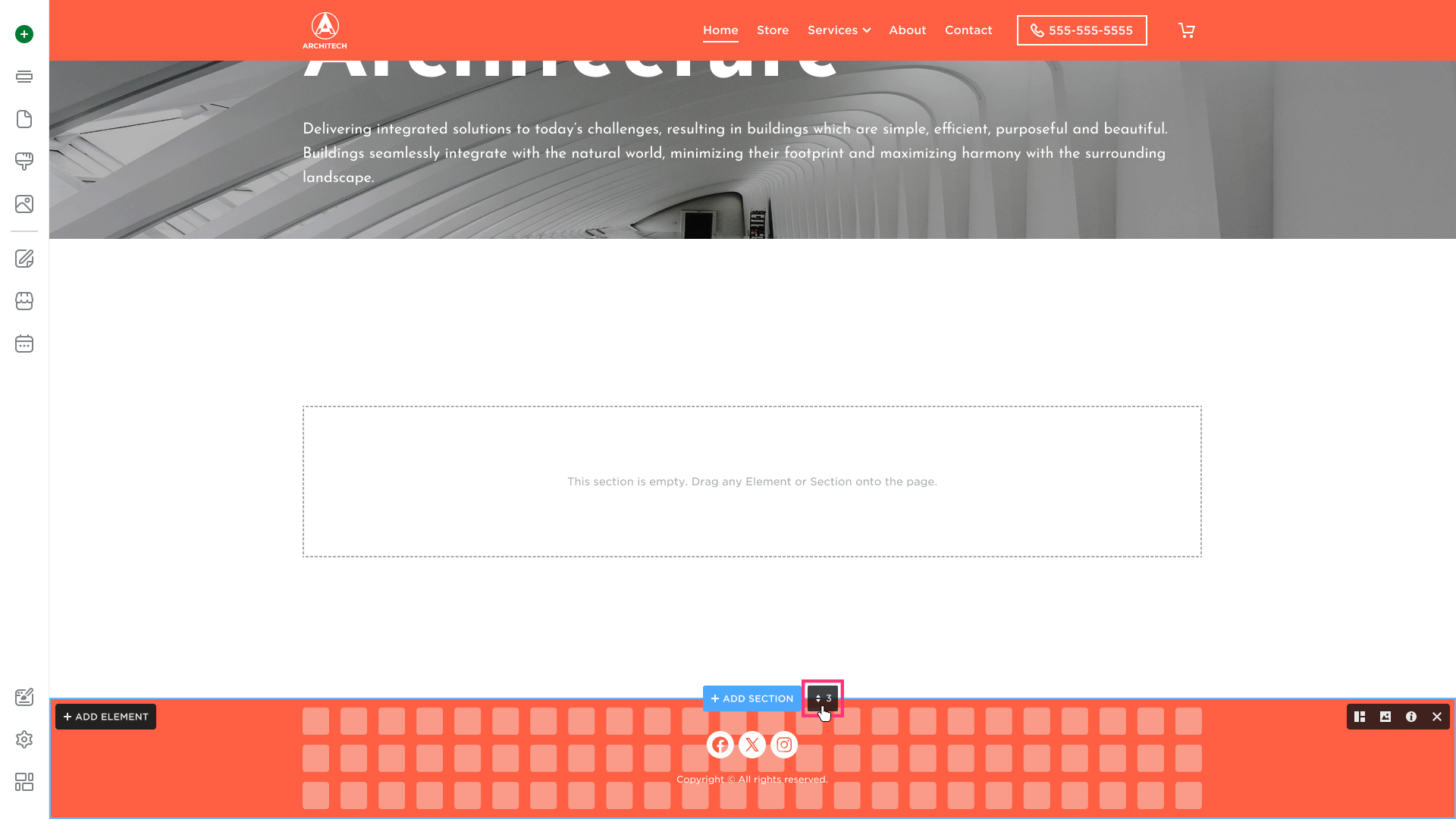 - The new section will immediately appear in the selected area. You can edit and add new elements to it to suit your needs.