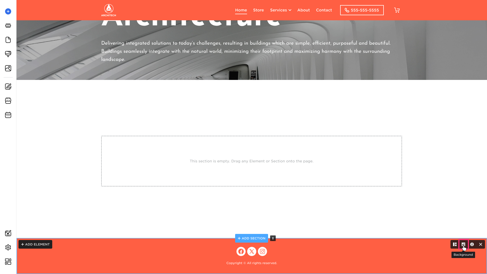 - Hover over the section, and click the Background button in the top-right sidebar:
