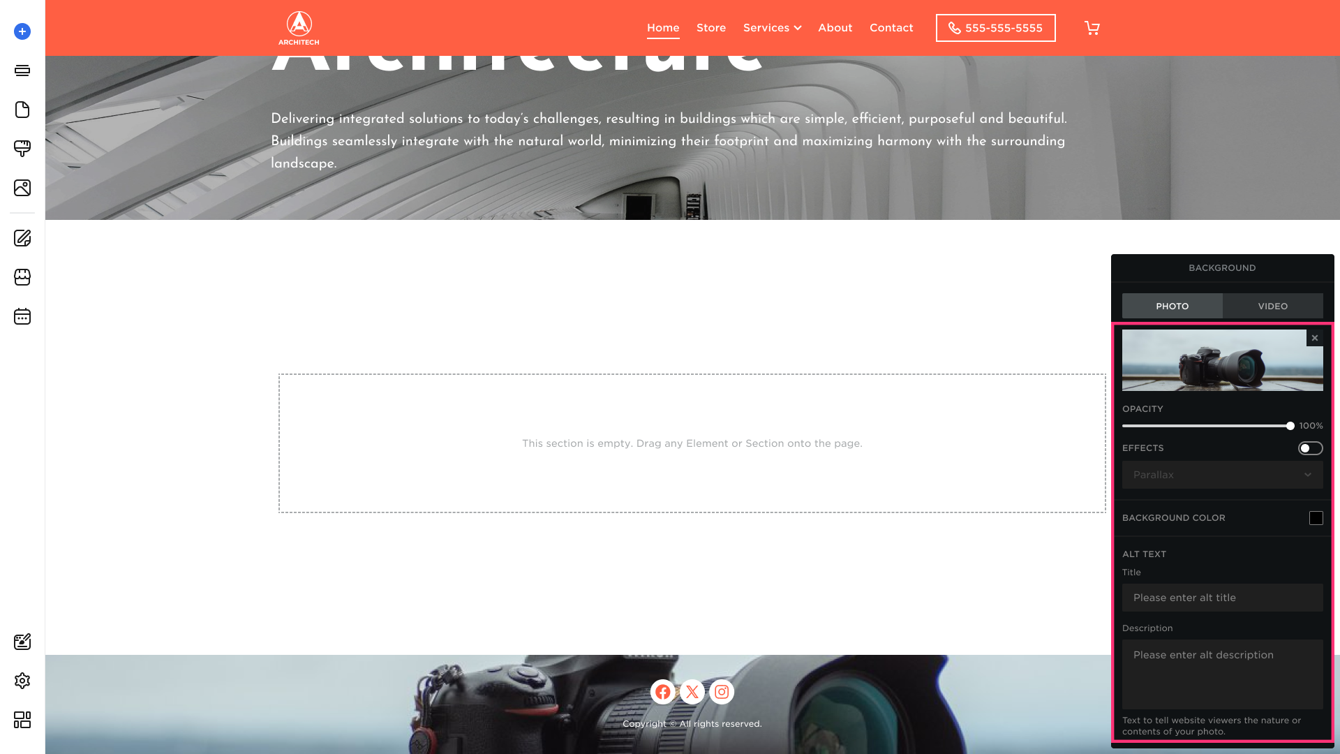 Background Photo type is usually set by default for the added section. Proceed to the Photo tab to be able to:
