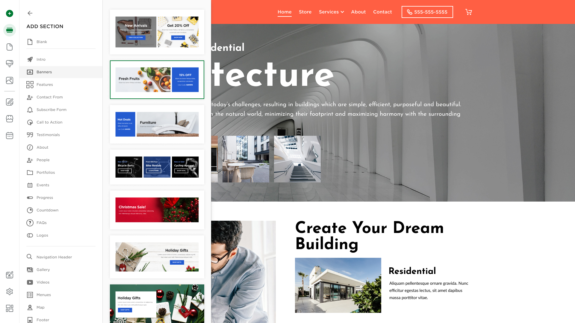 Site Editor offers a collection of ready-made Banners. Select a template Banner section, drag it from the library, drop it onto an available placeholder, and then configure it to suit your needs:
