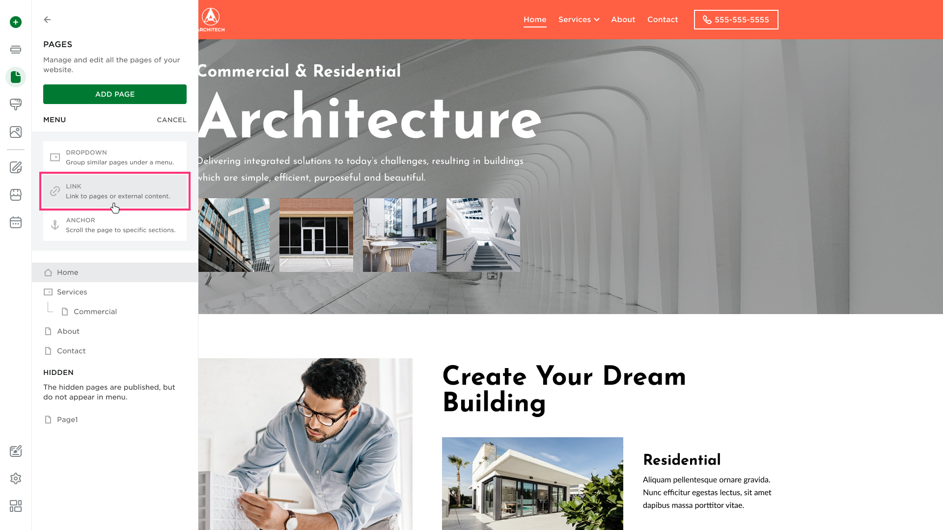 - The Link will immediately appear in the Navigation Menu and the Menu section in Pages: