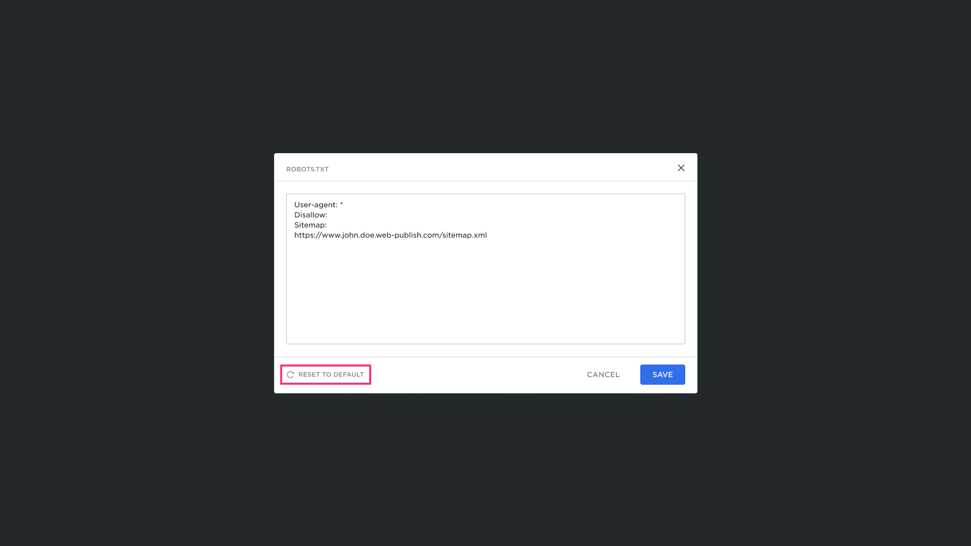 - Manual Reset: Click the Reset to Default button while in the Robots.txt editing mode: