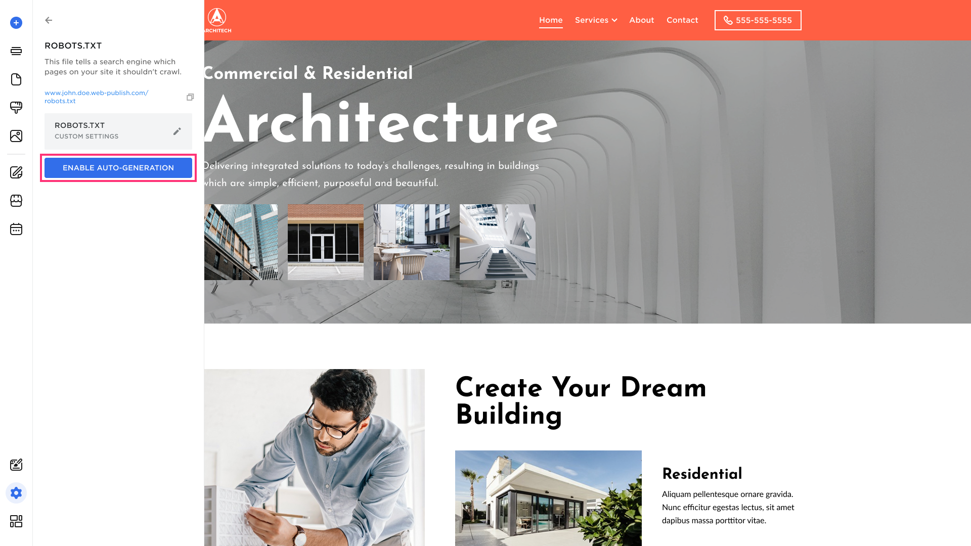 - To be able to edit the Robots.txt file, click the disable auto-generation, then edit the file by clicking the Edit icon on the right: