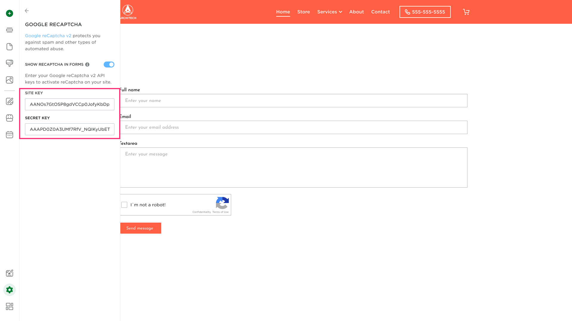Please Note: Currently, only reCAPTCHA v2 is supported by the Site Editor.