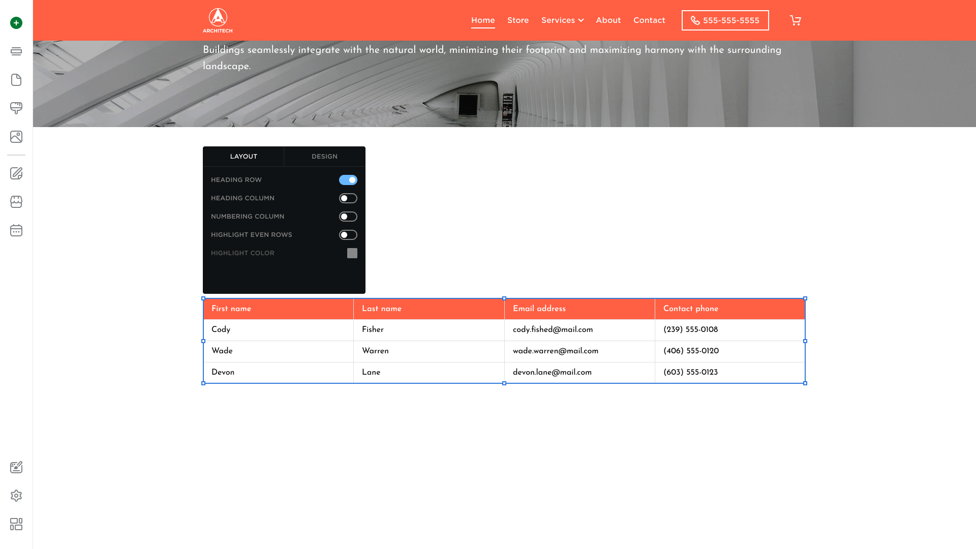 - Heading Column. Turn on the toggle to enable the heading column for the Table.