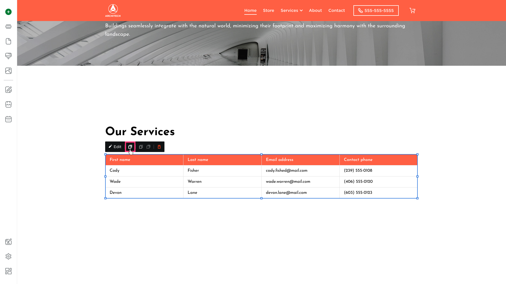 - To duplicate the table, click on the element and choose the Duplicate button that appears in its toolbar: